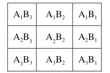 根据上述最小抑菌浓度测定结果,采用棋盘稀释法[23]进行联合抑菌实验。用含吐温-80的无菌水稀释经0.22 μm膜过滤灭菌的肉桂精油,分别得到剂量梯度为4 MIC、2 MIC、1 MIC的肉桂精油乳液(A)。用一定质量的草鱼鱼鳞抗菌肽配制质量浓度梯度为4 MIC、2 MIC、1 MIC的草鱼鱼鳞抗菌肽溶液(B)。取9 支含3 mL肉汤培养基的无菌试管,按照横排3 管纵列3 管的顺序排布,根据三因子二次正交法复配后,使得A、B的最终质量浓度分布如图1所示。在各组试管中分别加入200 μL受试菌悬液,漩涡振荡混匀,细菌置于37 ℃培养24 h,真菌28 ℃培养48 h,按1.3.2节法对各试管内菌株生长情况进行检验,实验重复3 次,取平均值。