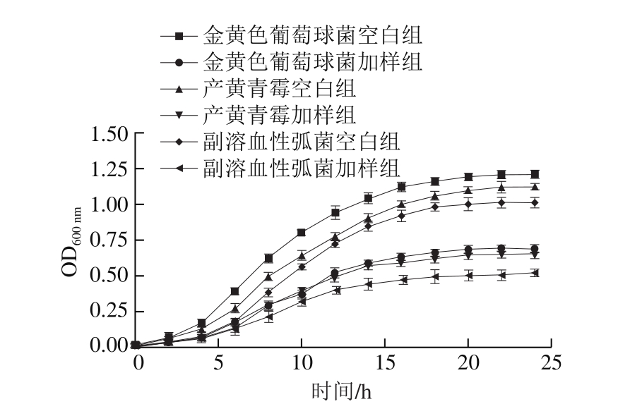 采用分光光度法[24]分析抑菌剂对受试菌生长曲线的影响。将受试菌株培养至对数生长期(1×106 CFU/mL),分别加入1/4 MIC复配抑菌剂,以吐温-80水溶液作为空白对照。将对照组和实验组放入摇床中进行同步培养,每隔2 h取出对应的试管,振荡器上振荡8 s,立即用紫外-可见分光光度计测定OD600 nm,连续测定24 h,记录实验结果,平行3 次取平均值。以抑菌时间为横坐标,OD600 nm为纵坐标,绘制复配抑菌剂作用下受试菌的生长曲线。