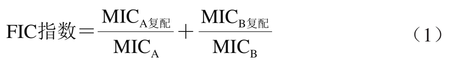 式中:MICA复配为A和B联用时A对应的最小抑菌浓度;MICB复配为A和B联用时B对应的最小抑菌浓度;MICA为A单独使用时的最小抑菌浓度;MICB为B单独使用时的最小抑菌浓度。