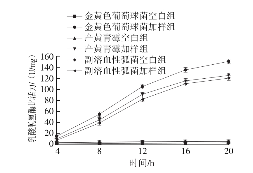 由图5可知,加样组的胞外乳酸脱氢酶比活力均明显高于对照组,在4~12 h内胞外乳酸脱氢酶比活力增加明显,12 h后相对减缓。可能是抑菌剂作用于受试菌体细胞膜上的某些靶点,使得细胞膜受到一定程度的损伤后原先存在于细胞质中的乳酸脱氢酶外泄至膜外。随着作用时间的延长,由于胞内的乳酸脱氢酶不断地溢出,严重影响了细胞正常的糖酵解及呼吸代谢过程,从而达到了抑菌作用。