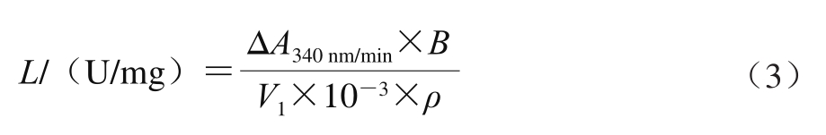 式中:L为乳酸脱氢酶比活力/(U/mg);ΔA340 nm/min为每分钟吸光度变化值;B为稀释倍数;V1为上清液体积/μL;ρ为蛋白质量浓度/(mg/mL)。