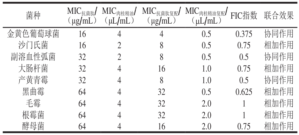 草鱼鱼鳞抗菌肽与肉桂精油联用时对金黄色葡萄球菌、副溶血性弧菌、产黄青霉的FIC指数分别为0.375、0.5、0.5,表现为协同作用;对沙门氏菌、大肠杆菌、黑曲霉、毛霉、根霉菌、酵母菌的FIC指数大于0.5,表现为相加作用;对所有受试菌均无拮抗作用。复配抑菌剂中鱼鳞抗菌肽MIC范围为4~32 μg/mL,肉桂精油为0.5~2.0 μL/mL,均优于单独使用的效果。