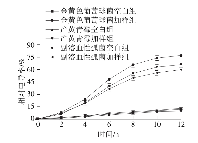 由图3可以看出,复配剂对受试菌的生长曲线产生了不同程度的影响。在0~2 h内,空白组与加样组菌体的生长速率相差不明显,2~16 h加样组生长速率明显较慢,16~24 h内两组的菌体生长速率都有所减慢,且样品组减慢的速率更快,该现象与卢晓等[32]研究发现0.2 mg/mL没食子酸对金黄色葡萄球菌生长曲线的影响相似。可能是复配抑菌剂的存在一定程度上影响了受试菌的生长周期,导致菌体对数生长期缩短、衰亡期加快以及生长速率缓慢,从而达到抑菌作用。