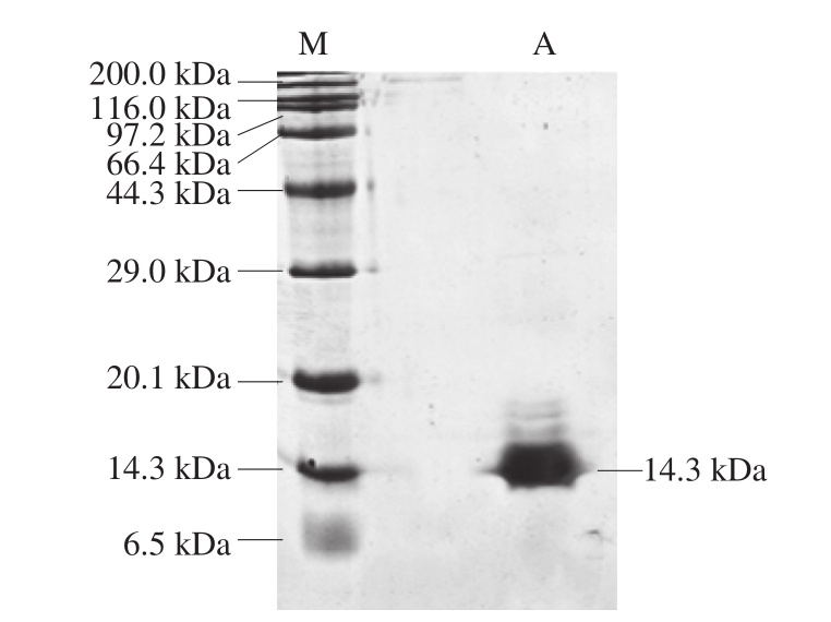 由图2可知,分离纯化后的草鱼鱼鳞抗菌肽只显示出单一条带,说明草鱼鱼鳞抗菌肽已达到电泳纯。利用凝胶成像系统软件分析得出其分子质量约为14.3 kDa。