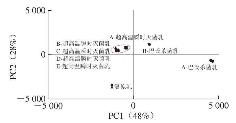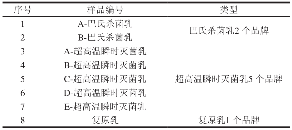 序号 样品编号 类型1 A-巴氏杀菌乳 巴氏杀菌乳2 个品牌2 B-巴氏杀菌乳3 A-超高温瞬时灭菌乳复原乳 复原乳1 个品牌4 B-超高温瞬时灭菌乳5 C-超高温瞬时灭菌乳6 D-超高温瞬时灭菌乳7 E-超高温瞬时灭菌乳8超高温瞬时灭菌乳5 个品牌