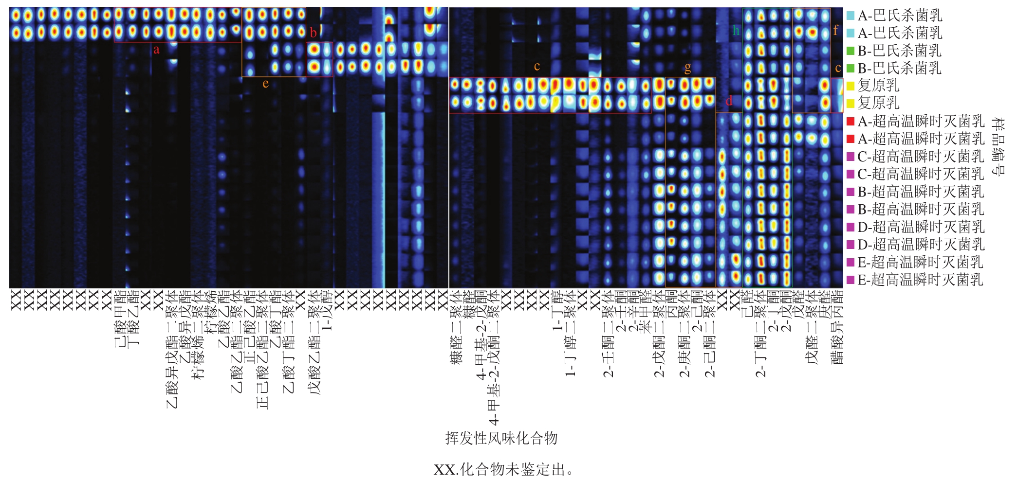 为进一步比较不同乳制品之间挥发性风味化合物的差异,由GC-IMS二维图谱中所有谱峰重构指纹图谱,以识别不同乳制品的特征峰区域[12,31]。如图2所示,图中亮点的颜色及深浅表示含量的高低。不同乳制品检出的挥发性风味化合物分布不同,各自有特征峰区域,同时也有共同区域[12,32]。a区为A-巴氏杀菌乳的特征峰区域,包括的风味物质为己酸甲酯、丁酸乙酯、乙酸异戊酯、乙酸乙酯、柠檬烯。b区为B-巴氏杀菌乳的特征峰区域,包括的风味物质为戊酸乙酯、1-戊醇。c区为复原乳的特征峰区域,包括的风味物质为糠醛、苯甲醛、4-甲基-2-戊酮、2-辛酮、1-丁醇、醋酸异丙酯。d区为超高温瞬时灭菌乳的特征峰区域,是乳制品超高温灭菌过程[20]产生的一些新挥发性化合物,这些化合物尚未鉴定出。e区、f区、g区为巴氏杀菌乳、复原乳、超高温瞬时灭菌乳两两交互的共同区域,包括的风味物质有正己酸乙酯、乙酸丁酯、戊醛、庚醛、丙酮、2-庚酮、2-己酮。h区为巴氏杀菌乳、复原乳、超高温瞬时灭菌乳的共同区域,包括的风味物质有己醛、2-丁酮、2-戊酮,这些共同区域的化合物大多为醛、酮类化合物。
