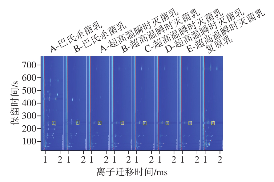 Fig.1 Two-dimensional GC-IMS spectra of volatile flavor compounds of dairy products