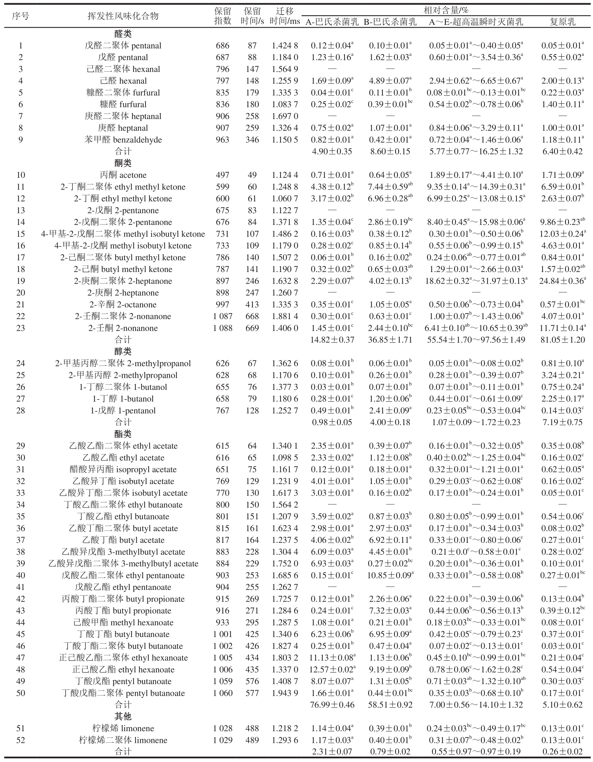 序号 挥发性风味化合物 保留指数保留时间/s迁移时间/ms相对含量/%A-巴氏杀菌乳 B-巴氏杀菌乳 A~E-超高温瞬时灭菌乳 复原乳醛类1戊醛二聚体 pentanal 686 87 1.424 8 0.12±0.04a 0.10±0.01a 0.05±0.01a~0.40±0.05a 0.05±0.01a 2戊醛 pentanal 687 88 1.184 0 1.23±0.16a 1.62±0.03a 0.60±0.01a~3.54±0.36a 0.55±0.02a 3己醛二聚体 hexanal 796 147 1.564 9 — — — —4己醛 hexanal 797 148 1.255 9 1.69±0.09a 4.89±0.07a 2.94±0.62a~6.65±0.67a 2.00±0.13a 5糠醛二聚体 furfural 835 179 1.335 3 0.04±0.01c 0.11±0.01b 0.08±0.01bc~0.13±0.01bc 0.22±0.03a 6糠醛 furfural 836 180 1.083 7 0.25±0.02c 0.39±0.01bc 0.54±0.02b~0.78±0.06b 1.40±0.11a 7庚醛二聚体 heptanal 906 258 1.697 0 — — — —8庚醛 heptanal 907 259 1.326 4 0.75±0.02a 1.07±0.01a 0.84±0.06a~3.29±0.11a 1.00±0.01a苯甲醛 benzaldehyde 963 346 1.150 5 0.82±0.01a 0.42±0.01a 0.72±0.04a~1.46±0.06a 1.18±0.11a合计 4.90±0.35 8.60±0.15 5.77±0.77~16.25±1.32 6.40±0.42酮类10 丙酮 acetone 497 49 1.124 4 0.71±0.01a 0.64±0.05a 1.89±0.17a~4.41±0.10a 1.71±0.09a 11 2-丁酮二聚体 ethyl methyl ketone 599 60 1.248 8 4.38±0.12b 7.44±0.59ab 9.35±0.14a~14.39±0.31a 6.59±0.01b 12 2-丁酮 ethyl methyl ketone 600 61 1.060 7 3.17±0.02b 6.96±0.28ab 6.99±0.25a~13.08±0.15a 2.63±0.07b 13 2-戊酮 2-pentanone 675 83 1.122 7 — — — —14 2-戊酮二聚体 2-pentanone 676 84 1.371 8 1.35±0.04c 2.86±0.19bc 8.40±0.45a~15.98±0.06a 9.86±0.23ab 15 4-甲基-2-戊酮二聚体 methyl isobutyl ketone 731 107 1.486 2 0.16±0.03b 0.38±0.12b 0.30±0.01b~0.50±0.06b 12.03±0.24a 16 4-甲基-2-戊酮 methyl isobutyl ketone 733 109 1.179 0 0.28±0.02c 0.85±0.14b 0.55±0.06b~0.99±0.15b 4.63±0.01a 17 2-己酮二聚体 butyl methyl ketone 786 140 1.507 2 0.06±0.01b 0.16±0.02b 0.24±0.06ab~0.77±0.01ab 0.84±0.01a 18 2-己酮 butyl methyl ketone 787 141 1.190 7 0.32±0.02b 0.65±0.03ab 1.29±0.01a~2.66±0.03a 1.57±0.02ab 19 2-庚酮二聚体 2-heptanone 897 246 1.632 8 2.29±0.07b 4.02±0.13b 18.62±0.32a~31.97±0.13a 24.84±0.36a 20 2-庚酮 2-heptanone 898 247 1.260 7 — — — —21 2-辛酮 2-octanone 997 413 1.335 3 0.35±0.01c 1.05±0.05a 0.50±0.06b~0.73±0.04b 0.57±0.01bc 22 2-壬酮二聚体 2-nonanone 1 087 668 1.881 4 0.30±0.01c 0.63±0.01c 1.00±0.07b~1.43±0.06b 4.07±0.01a 23 2-壬酮 2-nonanone 1 088 669 1.406 0 1.45±0.01c 2.44±0.10bc 6.41±0.10ab~10.65±0.39ab 11.71±0.14a合计 14.82±0.37 36.85±1.71 55.54±1.70~97.56±1.49 81.05±1.20醇类24 2-甲基丙醇二聚体 2-methylpropanol 626 67 1.362 6 0.08±0.01b 0.06±0.01b 0.05±0.01b~0.08±0.02b 0.81±0.10a 25 2-甲基丙醇 2-methylpropanol 628 68 1.170 6 0.10±0.01b 0.26±0.01b 0.28±0.01b~0.39±0.07b 3.24±0.21a 26 1-丁醇二聚体 1-butanol 655 76 1.377 3 0.03±0.01b 0.07±0.01b 0.07±0.01b~0.11±0.01b 0.75±0.24a 27 1-丁醇 1-butanol 658 79 1.180 6 0.28±0.01c 1.20±0.06b 0.44±0.01c~0.61±0.09c 2.25±0.17a 28 1-戊醇 1-pentanol 767 128 1.252 7 0.49±0.01b 2.41±0.09a 0.23±0.05bc~0.53±0.04bc 0.14±0.03c合计 0.98±0.05 4.00±0.18 1.07±0.09~1.72±0.23 7.19±0.75酯类29 乙酸乙酯二聚体 ethyl acetate 615 64 1.340 1 2.35±0.01a 0.39±0.07b 0.16±0.01b~0.32±0.05b 0.35±0.08b 30 乙酸乙酯 ethyl acetate 616 65 1.098 5 2.33±0.02a 1.12±0.08b 0.40±0.02bc~1.25±0.04bc 0.16±0.02c 31 醋酸异丙酯 isopropyl acetate 651 75 1.161 7 0.12±0.01a 0.18±0.01a 0.32±0.01a~1.21±0.01a 0.62±0.05a 32 乙酸异丁酯 isobutyl acetate 769 129 1.231 9 4.01±0.01a 1.05±0.01b 0.29±0.03c~0.62±0.08c 0.16±0.02c 33 乙酸异丁酯二聚体 isobutyl acetate 770 130 1.617 3 3.03±0.01a 0.16±0.02b 0.17±0.01b~0.24±0.01b 0.05±0.01c 34 丁酸乙酯二聚体 ethyl butanoate 800 150 1.564 2 — — — —35 丁酸乙酯 ethyl butanoate 801 151 1.207 9 3.59±0.02a 0.87±0.03b 0.80±0.05b~0.99±0.01b 0.54±0.06c 36 乙酸丁酯二聚体 butyl acetate 815 161 1.623 4 2.98±0.01a 2.97±0.03a 0.17±0.01b~0.34±0.03b 0.08±0.02b 37 乙酸丁酯 butyl acetate 817 164 1.237 5 4.06±0.02b 6.92±0.11a 0.33±0.01c~0.80±0.06c 0.27±0.01c 38 乙酸异戊酯 3-methylbutyl acetate 883 228 1.304 4 6.09±0.03a 4.45±0.01b 0.21±0.0c~0.58±0.01c 0.28±0.02c 39 乙酸异戊酯二聚体 3-methylbutyl acetate 884 229 1.752 0 6.93±0.03a 0.27±0.02bc 0.20±0.01b~0.36±0.01b 0.10±0.01c 40 戊酸乙酯二聚体 ethyl pentanoate 903 253 1.685 6 0.15±0.01c 10.85±0.09a 0.33±0.01b~0.58±0.08b 0.27±0.01bc 41 戊酸乙酯 ethyl pentanoate 904 255 1.262 7 — — — —42 丙酸丁酯二聚体 butyl propionate 915 269 1.725 7 0.12±0.01b 2.26±0.06a 0.22±0.01b~0.39±0.06b 0.13±0.04b 43 丙酸丁酯 butyl propionate 916 271 1.284 6 0.24±0.01c 7.32±0.03a 0.44±0.06b~0.56±0.13b 0.39±0.12bc 44 己酸甲酯 methyl hexanoate 933 295 1.287 5 1.08±0.01a 0.21±0.01b 0.18±0.03bc~0.33±0.01bc 0.08±0.01c 45 丁酸丁酯 butyl butanoate 1 001 425 1.340 6 6.23±0.06b 6.95±0.09a 0.42±0.05c~0.79±0.23c 0.37±0.01c 46 丁酸丁酯二聚体 butyl butanoate 1 002 426 1.827 4 0.25±0.01b 0.47±0.04a 0.07±0.02c~0.13±0.01c 0.03±0.01c 47 正己酸乙酯二聚体 ethyl hexanoate 1 005 434 1.803 2 11.13±0.08a 1.13±0.06b 0.45±0.10bc~0.99±0.01bc 0.21±0.04c 48 正己酸乙酯 ethyl hexanoate 1 006 435 1.337 0 12.57±0.02a 9.19±0.09b 0.78±0.06c~1.62±0.28c 0.54±0.04c 49 丁酸戊酯 pentyl butanoate 1 059 576 1.408 7 8.07±0.07a 1.31±0.05b 0.71±0.03ab~1.32±0.10ab 0.30±0.03c 50 丁酸戊酯二聚体 pentyl butanoate 1 060 577 1.943 9 1.66±0.01a 0.44±0.01bc 0.35±0.03b~0.68±0.10b 0.17±0.01c合计 76.99±0.46 58.51±0.92 7.00±0.56~14.10±1.32 5.10±0.62其他51 柠檬烯 limonene 1 028 488 1.218 2 1.14±0.04a 0.39±0.01b 0.24±0.03bc~0.49±0.17bc 0.13±0.01c 52 柠檬烯二聚体 limonene 1 029 489 1.293 6 1.17±0.03a 0.40±0.01b 0.31±0.07b~0.48±0.02b 0.13±0.01c合计 2.31±0.07 0.79±0.02 0.55±0.97~0.97±0.19 0.26±0.02 9