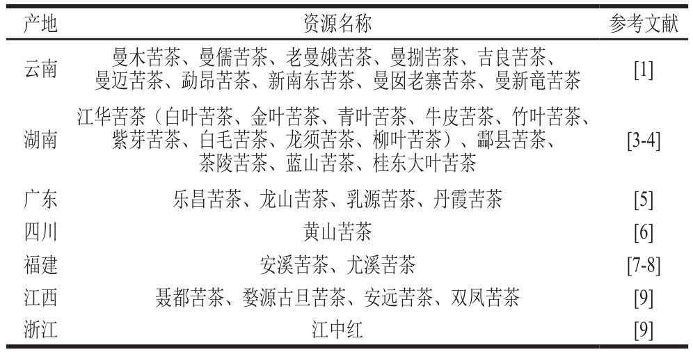 产地 资源名称 参考文献云南 曼木苦茶、曼儒苦茶、老曼娥苦茶、曼捌苦茶、吉良苦茶、曼迈苦茶、勐昂苦茶、新南东苦茶、曼囡老寨苦茶、曼新竜苦茶 [1]湖南江华苦茶(白叶苦茶、金叶苦茶、青叶苦茶、牛皮苦茶、竹叶苦茶、紫芽苦茶、白毛苦茶、龙须苦茶、柳叶苦茶)、酃县苦茶、茶陵苦茶、蓝山苦茶、桂东大叶苦茶[3-4]广东 乐昌苦茶、龙山苦茶、乳源苦茶、丹霞苦茶 [5]四川 黄山苦茶 [6]福建 安溪苦茶、尤溪苦茶 [7-8]江西 聂都苦茶、婺源古旦苦茶、安远苦茶、双凤苦茶 [9]浙江 江中红 [9]