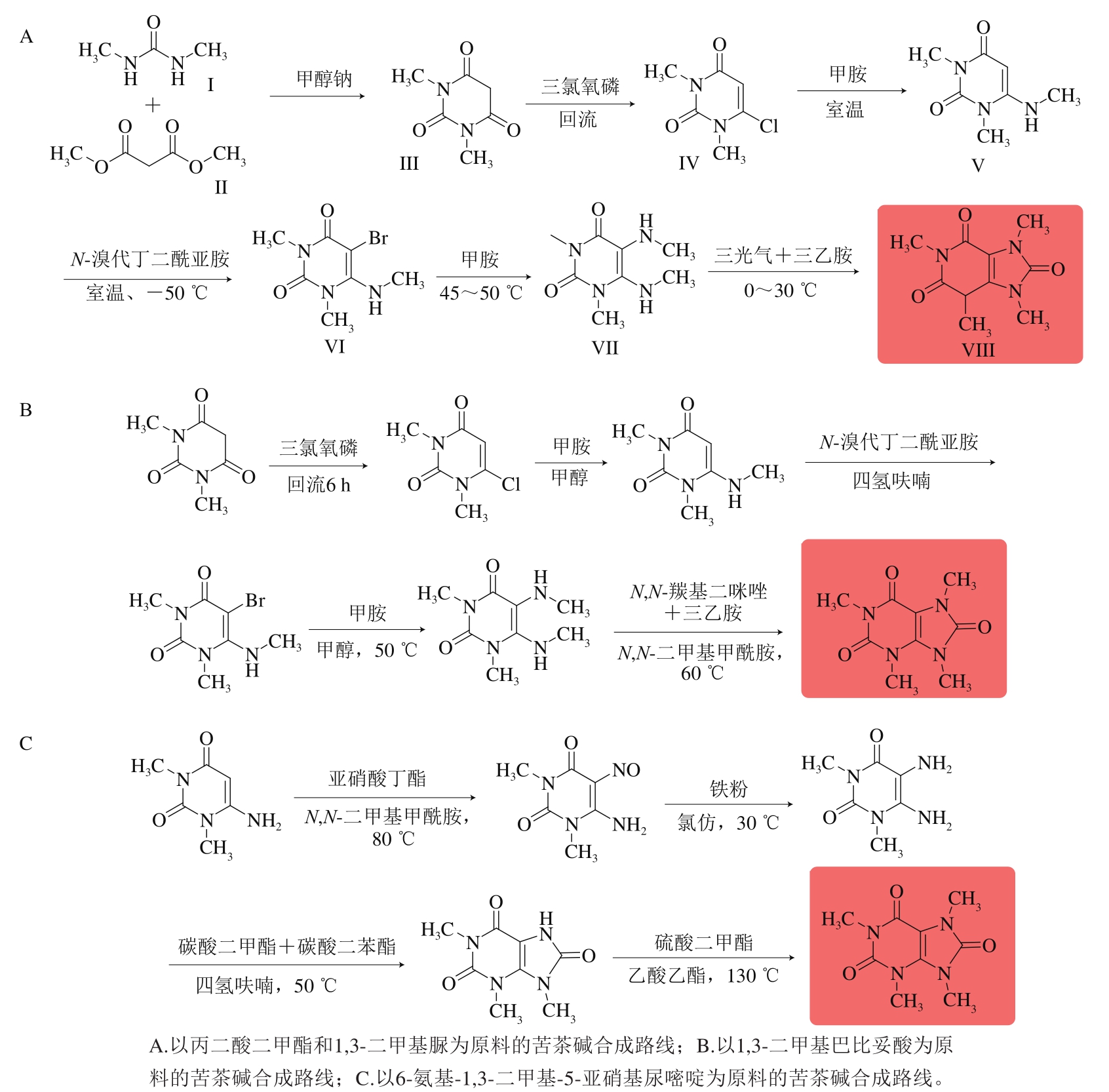 通过化学合成的方法可获得大量的高纯度苦茶碱,但是目前有关苦茶碱化学合成的研究相对较少。于少静[37]以1,3-二甲基脲(I)和丙二酸二甲酯(II)为原料,以甲醇钠作为催化剂,合成1,3-二甲基巴比妥酸(III);1,3-二甲基巴比妥酸与卤代试剂三氯氧磷反应,生成6-氯-1,3-二甲基嘧啶-2,4-二酮(IV);6-氯-1,3-二甲基嘧啶-2,4-二酮在室温下与甲胺反应合成1,3-二甲基-6-甲氨基嘧啶-2,4-二酮(V);1,3-二甲基-6-甲氨基嘧啶-2,4-二酮与卤代试剂N-溴代丁二酰亚胺反应生成5-溴-1,3-二甲基-6-甲氨基嘧啶-2,4-二酮(VI);5-溴-1,3-二甲基-6-甲氨基嘧啶-2,4-二酮与甲胺反应生成1,3-二甲基-5,6-二甲基嘧啶-2,4-二酮(VII);1,3-二甲基-5,6-二甲基嘧啶-2,4-二酮与三光气和三乙胺反应合成目标产物苦茶碱(VIII)(图2A)。该合成方法经过6 步反应,可获得总产率为38.33%的目标产物。