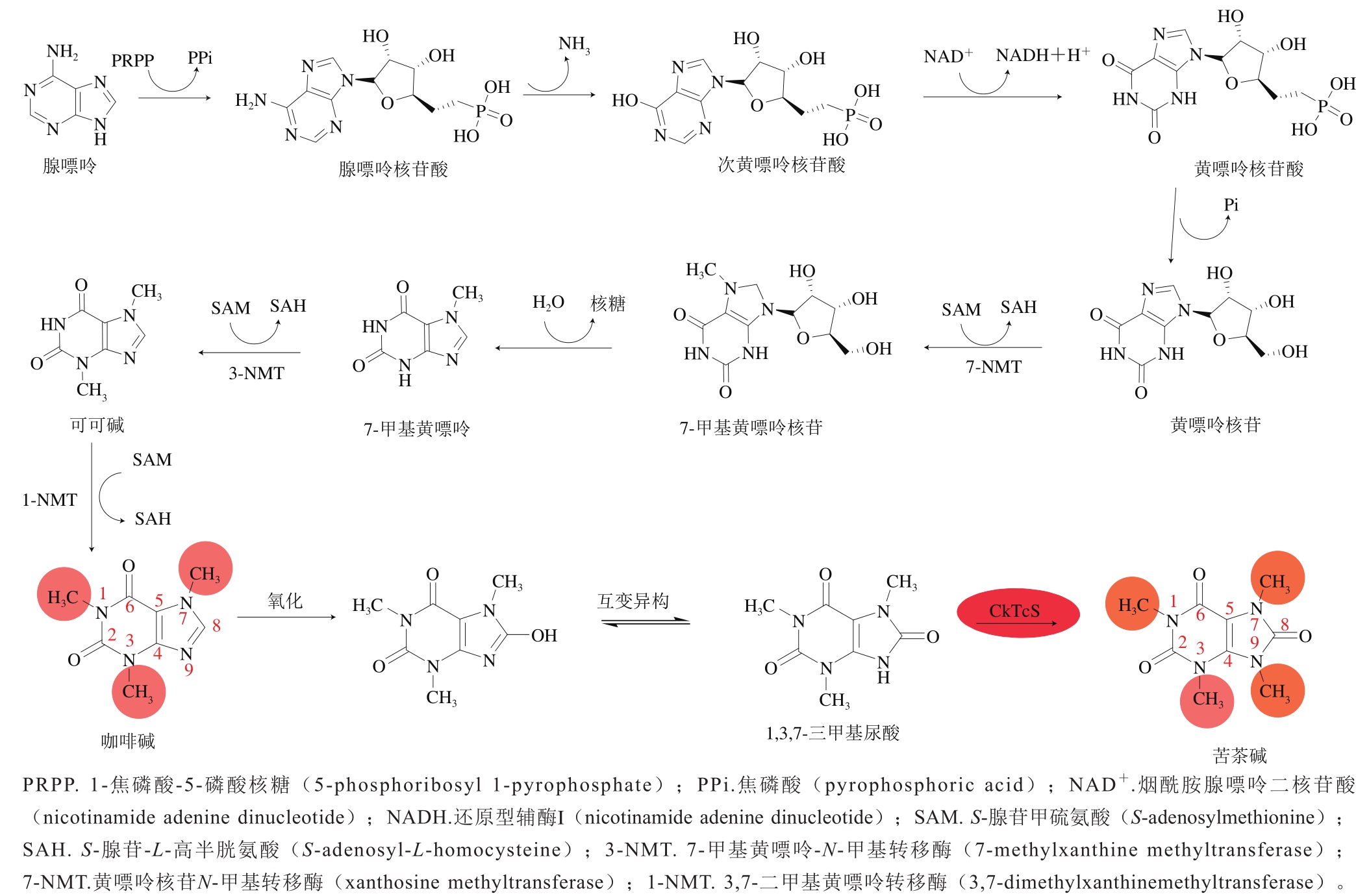 苦茶碱结构与咖啡碱相似,其N9位比咖啡碱多一个甲基、C8位比咖啡碱多一个酮基基团(图1)。自1999年叶创兴等[18]首次在苦茶中发现高含量的苦茶碱并揭示其与传统茶叶不同的嘌呤生物碱模式后,引起科研工作者对苦茶碱合成途径的广泛关注。