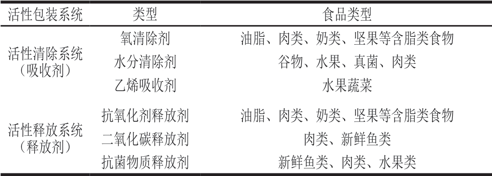 活性包装指主动向包装食品或食品周围环境释放或吸收某类物质成分的新型食品包装技术,可分为活性清除系统(添加吸收剂)和活性释放系统(添加释放剂)[67];前者用来去除食品或食品环境中不需要的化合物,后者则通过释放剂将所需的化合物添加到包装食品体系或包装顶部空间。活性包装在食品中的具体应用见表2。