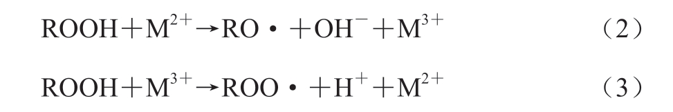 二是在变价金属离子的作用下催化分解,形成烷氧自由基(RO·)、烷过氧自由基(ROO·)以及氢离子(H+)和氢氧根离子(OH-),如式(2)、(3)所示。