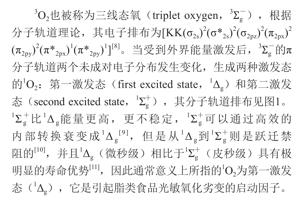 单线态氧(singlet oxygen,1O2)是一种重要的活性氧(reactive oxygen species,ROS)[1],其分子轨道具有与基态氧分子(ground state oxygen,3O2)不同的电子排布。1O2是一种激发态氧分子,活性很高,极易与食品中脂类物质的不饱和双键直接发生反应,使其氧化劣变,营养价值丧失。光敏氧化是脂类食品1O2来源途径中最主要的一种[2-3],即脂质中天然存在的色素[4-5]在光的作用下通过Type II途径产生1O2,迅速引发并促进食品中脂类物质的氧化[6]。1O2反应活性高,与脂类物质的氧化反应速率至少是3O2的1 500 倍[7],并且氧化过程中产生的游离基还可进一步引发脂类物质的自动氧化,因此,研究脂类食品中1O2的来源途径、氧化机理及安全有效的抑制技术引起了许多国内外研究者的兴趣,并取得了系列研究成果。本文对近年来本领域的最新国内外研究成果进行了对比和分析,从脂类食品中1O2的形成途径、光敏氧化机理及控制技术等方面进行了深入阐述和分析,以期为深入研究食品中脂类物质的光敏氧化及抑制技术提供理论依据。