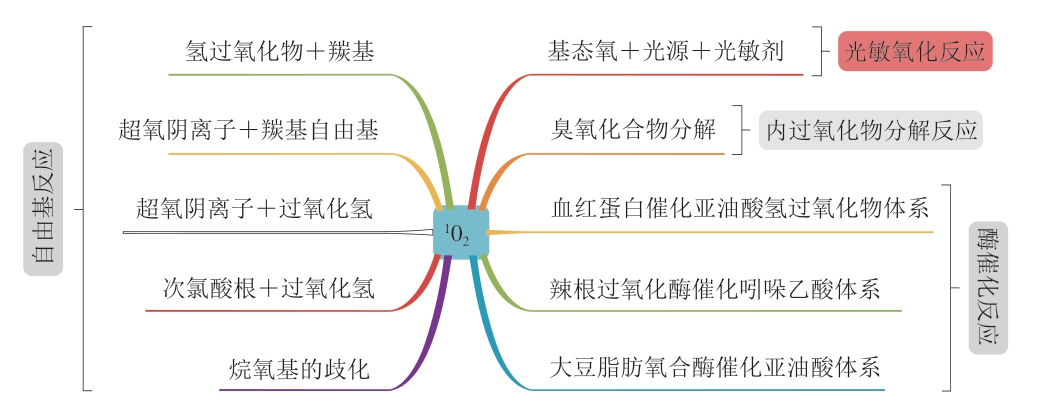 脂类食品中1O2的形成途径主要包括以下几种:酶催化反应[13-14]、自由基化学反应[12]、内过氧化物分解反应[12,15]和光敏氧化反应[16],具体如图2所示。其中,