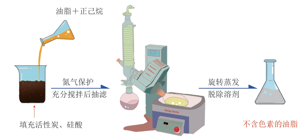 新型脱色材料如硅酸、硅胶、中性氧化铝、聚酰胺等的出现为油脂脱色提供了新的解决方案。为达到100%脱除油脂中叶绿素、β-胡萝卜素等色素的效果,一般是将上述几种材料组合使用。Abad等[58]根据层析分离的原理开发出一种脱除油脂中色素的新方法,其操作流程如图6所示,将油脂与一定比例的正己烷混合后加入活性碳和硅酸中,在氮气保护下进行充分搅拌,然后经抽滤和旋转蒸发等工序脱除溶剂,得到成品油脂。该法不仅可以完全去除油脂中的色素,而且具有操作简单、耗时短的优点,可作为传统油脂脱色技术的有效补充。然而,上述几种新型脱色材料对油脂中微量成分脱除的选择特异性较差,即在脱除叶绿素等色素的同时,也会造成PS、不饱和脂肪酸等功能性物质和营养物质的流失。以菜籽油为例,在使用中性氧化铝脱除叶绿素和β-胡萝卜素的同时,油脂中游离脂肪酸被完全脱除,生育酚损失99.9%以上,PS损失15%以上[59-61]。因此在使用新型脱色材料对植物油脱色的同时,也应该充分考虑到油脂中其他成分的损失。另外,上述新型脱色材料价格较为昂贵、成本高昂,因此该法目前仅适用于科研等领域,大规模工业化和商业化还需要进一步发展。