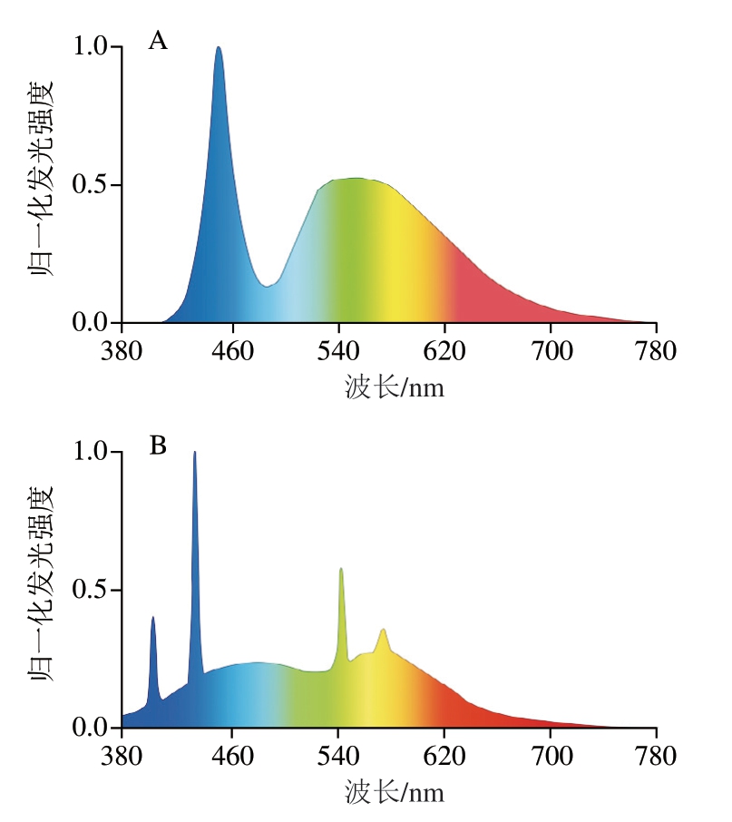 图7 LED灯(A)和荧光灯(B)的发光光谱[83]