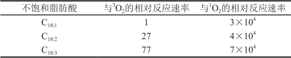 表1 单线态氧和三线态氧与不饱和脂肪酸的相对反应速率[17]Table1 Relative reaction rates of singlet and triplet oxygen with unsaturated fatty acids[17]