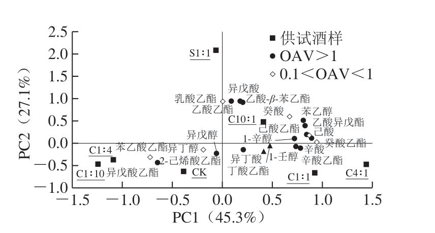 发酵香气成分共检测出30 种,包括8 种高级醇、13 种酯类物质、5 种脂肪酸和4 种苯乙基类化合物。对OAV大于0.1的发酵香气成分含量进行PCA,前2 个PC上的发酵香气成分载荷及酒样分布见图2。PC1、PC2分别占数据总体方差的45.3%和27.1%。大部分发酵香气成分和处理C10∶1、C4∶1及C1∶1分布于PC1的正向端,其中高级醇(1-辛醇、1-壬醇、异戊醇)和中链脂肪酸(C6~C12)及其乙酯集中分布,距离酒样C10∶1最近。乙酸乙酯、乳酸乙酯和乙酸β-苯乙酯集中分布于PC2的正向端上,距离酒样C10∶1和S1∶1较近。结合表1数据分析可得,随着优选胶红酵母接种比例的升高,混合发酵酒样中高级醇、中链脂肪酸及其乙酯含量增加,而S1∶1处理有利于提高乙酸酯、苯乙基类化合物的含量。