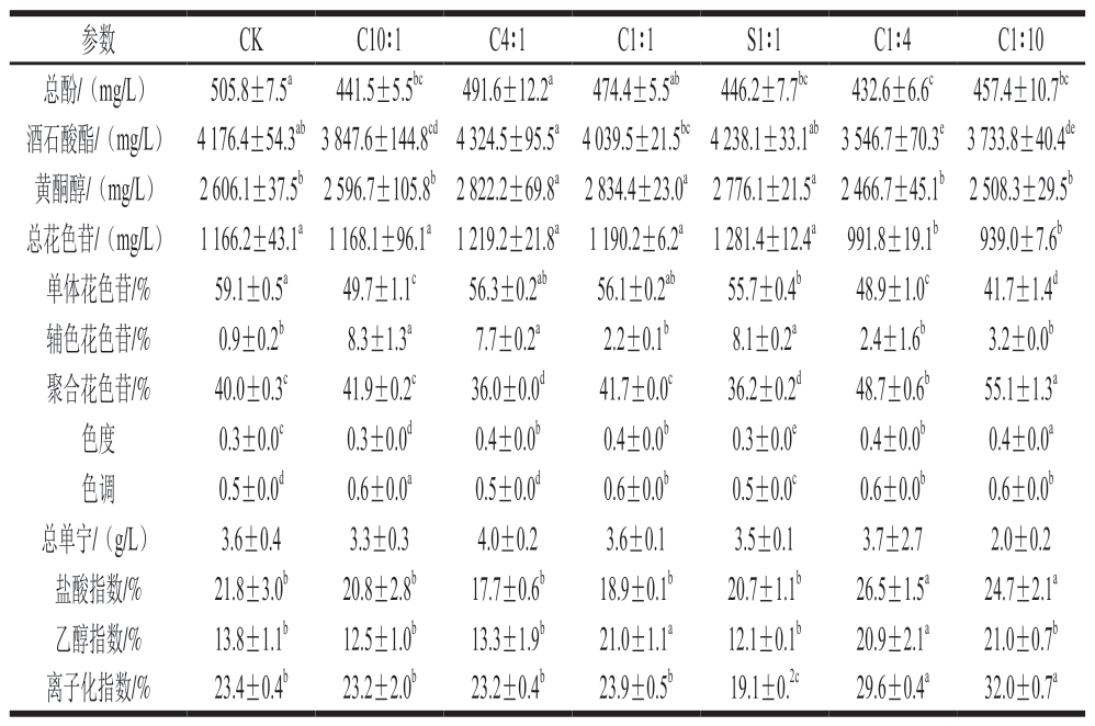 参数 CK C10∶1 C4∶1 C1∶1 S1∶1 C1∶4 C1∶10总酚/(mg/L) 505.8±7.5a 441.5±5.5bc 491.6±12.2a 474.4±5.5ab 446.2±7.7bc 432.6±6.6c 457.4±10.7bc酒石酸酯/(mg/L) 4 176.4±54.3ab 3 847.6±144.8cd 4 324.5±95.5a 4 039.5±21.5bc 4 238.1±33.1ab 3 546.7±70.3e 3 733.8±40.4de黄酮醇/(mg/L) 2 606.1±37.5b 2 596.7±105.8b 2 822.2±69.8a 2 834.4±23.0a 2 776.1±21.5a 2 466.7±45.1b 2 508.3±29.5b总花色苷/(mg/L) 1 166.2±43.1a 1 168.1±96.1a 1 219.2±21.8a 1 190.2±6.2a 1 281.4±12.4a 991.8±19.1b 939.0±7.6b单体花色苷/% 59.1±0.5a 49.7±1.1c 56.3±0.2ab 56.1±0.2ab 55.7±0.4b 48.9±1.0c 41.7±1.4d辅色花色苷/% 0.9±0.2b 8.3±1.3a 7.7±0.2a 2.2±0.1b 8.1±0.2a 2.4±1.6b 3.2±0.0b聚合花色苷/% 40.0±0.3c 41.9±0.2c 36.0±0.0d 41.7±0.0c 36.2±0.2d 48.7±0.6b 55.1±1.3a色度 0.3±0.0c 0.3±0.0d 0.4±0.0b 0.4±0.0b 0.3±0.0e 0.4±0.0b 0.4±0.0a色调 0.5±0.0d 0.6±0.0a 0.5±0.0d 0.6±0.0b 0.5±0.0c 0.6±0.0b 0.6±0.0b总单宁/(g/L) 3.6±0.4 3.3±0.3 4.0±0.2 3.6±0.1 3.5±0.1 3.7±2.7 2.0±0.2盐酸指数/% 21.8±3.0b 20.8±2.8b 17.7±0.6b 18.9±0.1b 20.7±1.1b 26.5±1.5a 24.7±2.1a乙醇指数/% 13.8±1.1b 12.5±1.0b 13.3±1.9b 21.0±1.1a 12.1±0.1b 20.9±2.1a 21.0±0.7b离子化指数/% 23.4±0.4b 23.2±2.0b 23.2±0.4b 23.9±0.5b 19.1±0.2c 29.6±0.4a 32.0±0.7a
