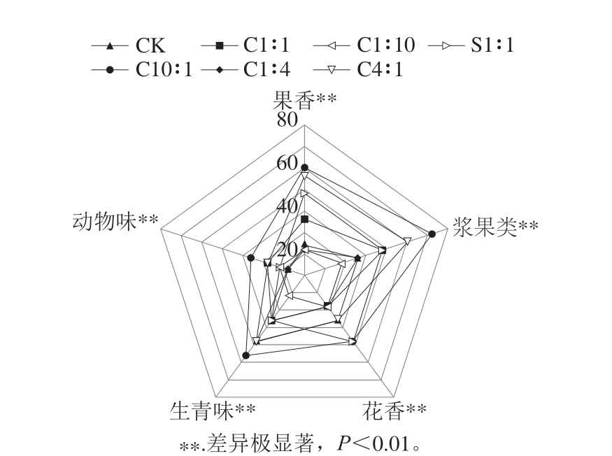 供试酒样香气特征的感官量化分析结果见图3。酒样中5 种香气特征的MF值较高,且在各处理间存在极显著差异(P<0.01)。果香(热带水果+甜果+酸果)和浆果类香气特征中,酒样C10∶1和C4∶1的MF值最高,其次是S1∶1和C1∶1酒样。酒样C10∶1和S1∶1的花香类香气特征MF值最高。此外,优选酵母高比例接种处理增加了酒样中动物类(皮革、麝香等)和生青味香气特征,而在对照酒样、S1∶1酒样中对应的MF值较低。分析可得,优选酵母高比例接种处理增强了酒样的果香和花香,但同时也引入了较强的动物味和生青味。S1∶1处理偏重于增强花香,并能降低不良气味。