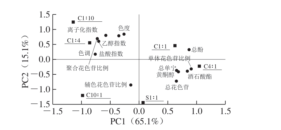 为进一步揭示不同处理对酒样色泽的影响,对上述各指标进行PCA。如图4所示,前2 个PC分别占总方差的65.1%和15.1%。总花色苷、酒石酸酯、黄酮醇等指标和酒样C4∶1、S1∶1位于第4象限。盐酸指数、聚合花色苷比例、色度、色调等指标和酒样C4∶1、C10∶1集中分布于第2象限。辅色花色苷比例距离酒样C10∶1较近。分析可得,优选酵母接种比例较高的酒样中,酚类物质、总花色苷含量以及单体花色苷、辅色花色苷比例较高,而随着接种比例的降低,聚合单宁、聚合花色苷比例、色度、色调等升高。