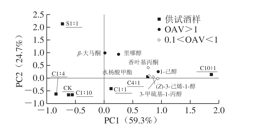 酒样中共检测出10 种品种香气成分,包括4 种萜烯类物质、1 种C13-去甲类异戊二烯化合物、2 种C6化合物、1 种硫醇和2 种酚酸酯。对OAV大于0.1的品种香气成分含量进行PCA,以揭示不同处理对其整体影响,结果见图1。PC1和PC2分别占数据总体方差的59.3%和24.7%。C6化合物、硫醇和酚酸酯类香气物质集中分布于酒样C4∶1的周围,位于PC1的正向端上,且与C10∶1酒样距离较近。里哪醇和β-大马酮位于PC2的正向端上,距离酒样C4∶1和S1∶1较近。综上分析可知,C4∶1、C10∶1处理能够显著增加酒样中C6化合物、硫醇等物质的含量,而S1∶1处理更利于促进萜烯类物质和β-大马酮的生成。