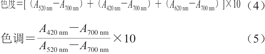 酒样稀释10 倍后,经0.45 μm滤膜过滤,利用10 mm光程比色皿测定在420、520、620 nm和700 nm波长处的吸光度[13]。计算公式如下: