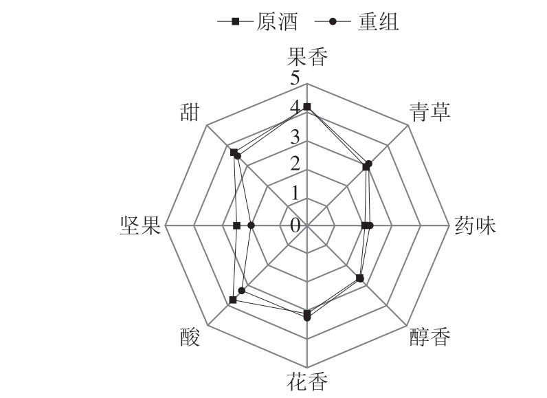重组实验对比分析:根据定量结果和文献中报道的阈值,计算得到OAV,以将53%乙醇溶液作为重组基质,将OAV大于1的17 种化合物按定量得到的浓度配制成混合溶液,室温平衡30 min,得重组酒样。按照上述相同的方法对重组的酒样进行感官评价,绘制出相应的香气轮廓图。