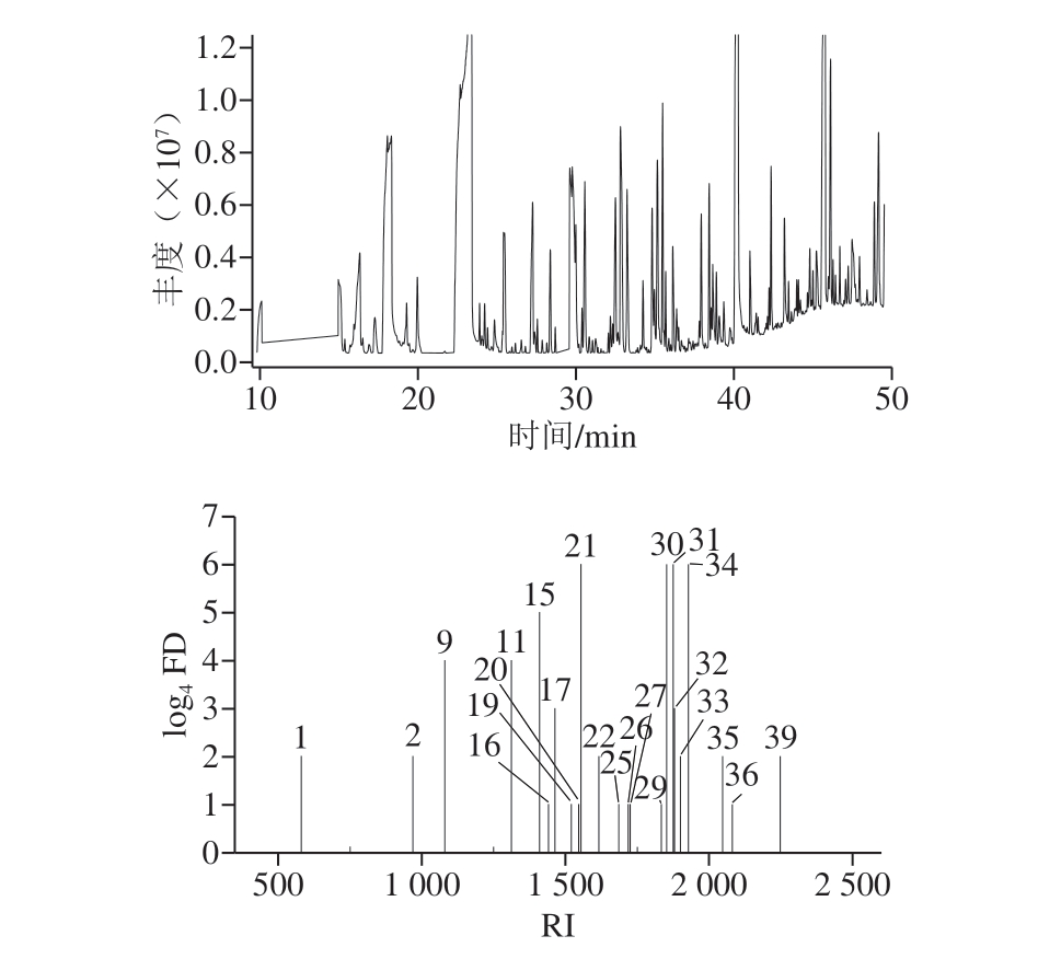 GC -MS -O 条件:DB - WAX 石 英 毛 细 柱(60 m×0.25 mm,0.25 µm);升温程序:初始温度40 ℃,以10 ℃/min升至50 ℃,保持3 min,再以3 ℃/min升至80 ℃,保持3 min,最后以6 ℃/min升至245 ℃,保持5 min;载气(He,99.999%)流速1.5 mL/min,进样量1.0 µL;不分流进样。