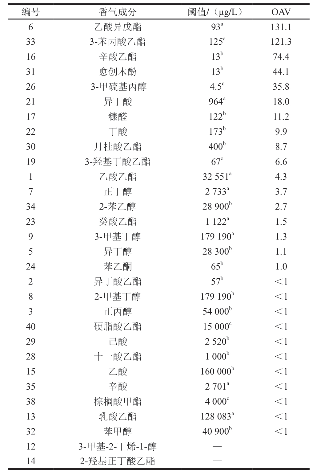 编号 香气成分 阈值/(μg/L) OAV 6乙酸异戊酯 93a 131.1 33 3-苯丙酸乙酯 125a 121.3 16 辛酸乙酯 13b 74.4 31 愈创木酚 13b 44.1 26 3-甲硫基丙醇 4.5c 35.8 21 异丁酸 964a 18.0 17 糠醛 122b 11.2 22 丁酸 173b 9.9 30 月桂酸乙酯 400b 8.7 19 3-羟基丁酸乙酯 67c 6.6 1乙酸乙酯 32 551a 4.3 7正丁醇 2 733a 3.7 34 2-苯乙醇 28 900b 2.7 23 癸酸乙酯 1 122a 1.5 9 3-甲基丁醇 179 190a 1.3 5异丁醇 28 300b 1.1 24 苯乙酮 65b 1.0 2异丁酸乙酯 57b <1 8 2-甲基丁醇 179 190b <1 3正丙醇 54 000b <1 40 硬脂酸乙酯 15 000c <1 29 己酸 2 520b <1 28 十一酸乙酯 1 000b <1 15 乙酸 160 000b <1 35 辛酸 2 701a <1 38 棕榈酸甲酯 4 000c <1 13 乳酸乙酯 128 083a <1 32 苯甲醇 40 900b <1 12 3-甲基-2-丁烯-1-醇 —14 2-羟基正丁酸乙酯 —