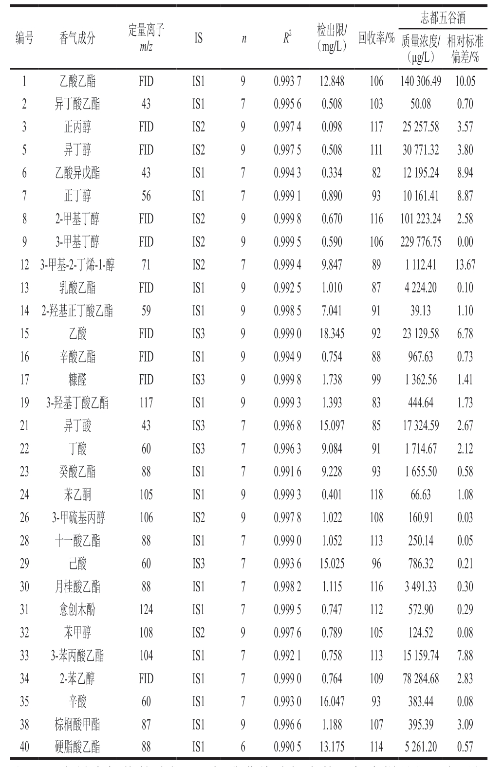 编号 香气成分 定量离子m/z IS n R2 检出限/(mg/L) 回收率/%志都五谷酒质量浓度/(μg/L)相对标准偏差/%1 乙酸乙酯 FID IS1 9 0.993 7 12.848 106 140 306.49 10.05 2 异丁酸乙酯 43 IS1 7 0.995 6 0.508 103 50.08 0.70 3 正丙醇 FID IS2 9 0.997 4 0.098 117 25 257.58 3.57 5 异丁醇 FID IS2 9 0.997 5 0.508 111 30 771.32 3.80 6 乙酸异戊酯 43 IS1 7 0.994 3 0.334 82 12 195.24 8.94 7 正丁醇 56 IS1 7 0.999 1 0.890 93 10 161.41 8.87 8 2-甲基丁醇 FID IS2 9 0.999 8 0.670 116 101 223.24 2.58 9 3-甲基丁醇 FID IS2 9 0.999 5 0.590 106 229 776.75 0.00 12 3-甲基-2-丁烯-1-醇 71 IS2 7 0.999 4 9.847 89 1 112.41 13.67 13 乳酸乙酯 FID IS1 9 0.992 5 1.010 87 4 224.20 0.10 14 2-羟基正丁酸乙酯 59 IS1 9 0.998 5 7.041 91 39.13 1.10 15 乙酸 FID IS3 9 0.999 0 18.345 9223 129.58 6.78 16 辛酸乙酯 FID IS1 9 0.994 9 0.754 88 967.63 0.73 17 糠醛 FID IS3 9 0.999 8 1.738 991 362.56 1.41 19 3-羟基丁酸乙酯 117 IS1 9 0.999 3 1.393 83 444.64 1.73 21 异丁酸 43 IS3 7 0.996 8 15.097 85 17 324.59 2.67 22 丁酸 60 IS3 7 0.996 3 9.084 911 714.67 2.12 23 癸酸乙酯 88 IS1 7 0.991 6 9.228 93 1 655.50 0.58 24 苯乙酮 105 IS1 9 0.999 3 0.401 118 66.63 1.08 26 3-甲硫基丙醇 106 IS2 9 0.997 8 1.022 108 160.91 0.03 28 十一酸乙酯 88 IS1 7 0.999 0 1.052 113 250.14 0.05 29 己酸 60 IS3 7 0.993 6 15.025 96 786.32 0.21 30 月桂酸乙酯 88 IS1 7 0.998 2 1.115 116 3 491.33 0.30 31 愈创木酚 124 IS1 7 0.999 5 0.747 112 572.90 0.29 32 苯甲醇 108 IS2 9 0.997 6 0.789 105 124.52 0.08 33 3-苯丙酸乙酯 104 IS1 7 0.992 1 0.758 113 15 159.74 7.88 34 2-苯乙醇 FID IS1 7 0.999 0 0.764 109 78 284.68 2.83 35 辛酸 60 IS1 7 0.993 016.047 93 383.44 0.08 38 棕榈酸甲酯 87 IS1 9 0.996 6 1.188 107 395.39 3.09 40 硬脂酸乙酯 88 IS1 6 0.990 5 13.175 114 5 261.20 0.57
