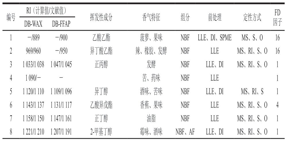 RI(计算值/文献值)编号 挥发性成分 香气特征 组分 前处理 定性方式 FD因子DB-WAX DB-FFAP 1 -/889 -/900 乙酸乙酯 菠萝、果味 NBF LLE、DI、SPME MS、S、O 16 2 969/960 -/950 异丁酸乙酯 辣、橡胶、发酵 NBF LLE MS、RI、S、O 16 3 1 033/1 038 1 047/1 045 正丙醇 发酵 NBF LLE、DI MS、RI、S、O 1 4 1 090/- - 苦、药味 NBF LLE 1 5 1 120/1 110 1 109/1 096 异丁醇 酒味、苦味 NBF LLE、DI MS、RI、S 1 6 1 143/1 137 1 131/1 117 乙酸异戊酯 香蕉、果味 NBF LLE MS、RI、S、O 4 7 1 158/1 150 1 147/1 161 正丁醇 油脂 NBF LLE MS、RI、S、O 1 8 1 221/1 210 1 207/1 191 2-甲基丁醇 霉味、酒味 NBF、AF LLE、DI MS、RI、S、O 1