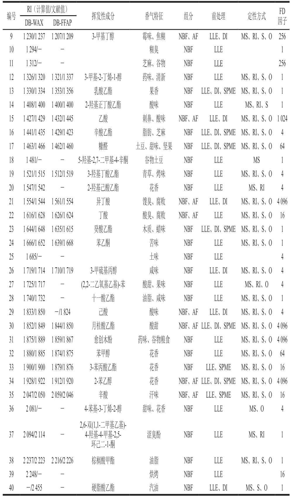 RI(计算值/文献值)编号 挥发性成分 香气特征 组分 前处理 定性方式 FD因子DB-WAX DB-FFAP 9 1 230/1 237 1 207/1 209 3-甲基丁醇 霉味、焦糊 NBF、AF LLE、DI MS、RI、S、O 256 10 1 294/- - 糊臭 NBF LLE 1 11 1 312/- - 芝麻、谷物 NBF LLE 256 12 1 326/1 320 1 321/1 337 3-甲基-2-丁烯-1-醇 药味、清新 NBF LLE MS、RI、S、O 1 13 1 330/1 334 1 353/1 356 乳酸乙酯 果香 NBF LLE、DI、SPME MS、RI、S、O 1 14 1 408/1 400 1 400/1 400 2-羟基正丁酸乙酯 酸味 NBF LLE MS、RI、S 1 15 1 427/1 429 1 432/1 445 乙酸 刺鼻、酸味 NBF、AF LLE、DI MS、RI、S、O 1 024 16 1 441/1 435 1 429/1 423 辛酸乙酯 脂肪、芝麻 NBF LLE、DI、SPME MS、RI、S、O 4 17 1 463/1 466 1 462/1 460 糠醛 土豆、甜味、坚果 NBF LLE、DI、SPME MS、RI、S、O 64 18 1 481/- - 5-羟基-2,7-二甲基-4-辛酮 谷物土豆 NBF LLE MS 1 19 1 521/1 515 1 512/1 519 3-羟基丁酸乙酯 青草、烤味 NBF LLE MS、RI、S、O 4 20 1 547/1 542 - 2-羟基己酸乙酯 花香 NBF LLE MS、RI 4 21 1 554/1 544 1 561/1 554 异丁酸 馊臭、腐败 NBF、AF LLE、DI MS、RI、S、O 4 096 22 1 616/1 628 1 626/1 624 丁酸 酸臭、腐败 NBF、AF LLE MS、RI、S、O 16 23 1 644/1 648 1 635/1 615 癸酸乙酯 木质、蜡味 NBF LLE、DI、SPME MS、RI、S、O 1 24 1 666/1 652 1 639/1 668 苯乙酮 苦味 NBF LLE MS、RI、S、O 1 25 1 685/- - 土味 NBF LLE 4 26 1 719/1 714 1 710/1 719 3-甲硫基丙醇 咸味 NBF LLE、DI MS、RI、S、O 4 27 1 725/1 717 - (2,2-二乙氧基乙基)-苯 酸甜、果味 NBF LLE MS、RI、O 4 28 1 740/1 732 - 十一酸乙酯 油脂、咸味 NBF LLE MS、RI、S、O 1 29 1 833/1 850 -/1 824 己酸 酸味 NBF、AF LLE、DI MS、RI、S、O 4 30 1 852/1 849 1 844/1 850 月桂酸乙酯 酸甜 NBF、AF LLE、DI、SPME MS、RI、S、O 4 096 31 1 875/1 889 1 859/1 867 愈创木酚 药味、谷物粮食 NBF LLE MS、RI、S、O 4 096 32 1 880/1 885 1 874/1 875 苯甲醇 花香 NBF LLE MS、RI、S、O 64 33 1 900/1 900 1 879/1 876 3-苯丙酸乙酯 花香 NBF LLE、SPME MS、RI、S、O 16 34 1 928/1 922 1 912/1 920 2-苯乙醇 花香 NBF、AF LLE、DI、SPME MS、RI、S、O 4 096 35 2 047/2 050 2 059/2 046 辛酸 汗味 NBF、AF LLE、SPME MS、RI、S、O 16 36 2 081/- - 4-苯基-3-丁烯-2-醇 甜味、花香 NBF LLE MS、O 4 37 2 094/2 114 -2,6-双(1,1-二甲基乙基)-4-羟基-4-甲基-2,5-环己二-1-酮涩臭酚 NBF LLE MS、RI 1 38 2 237/2 223 2 216/2 226 棕榈酸甲酯 油脂 NBF LLE MS、RI、S、O 1 39 2 248/- - 烘烤 NBF LLE 16 40 -/2 455 - 硬脂酸乙酯 汽油 NBF LLE、DI MS、S、O 1