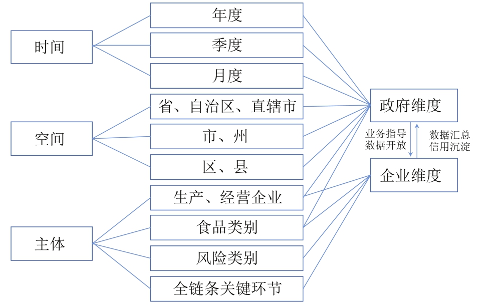 综上所述,本文提出一种全国一体化、基于大数据的食品安全风险分级模式(图1),涵盖年度、季度、月度等时间维度,省(自治区、直辖市)、市(州)、区(县)等空间维度,生产经营企业、食品类别、风险类别、全链条关键环节等主体要素维度,且对应归结到政府宏观与中观维度和企业微观维度,政府对企业风险分级管理进行业务指导,同时向企业开放数据,企业向政府上报数据,同时上报风险分级管理的结果,形成食品安全主体责任信用的沉淀。该模式可兼顾宏观与微观进行责任划分,涵盖了风险分级的时间、空间和主体主要维度,可实现数据的集聚和开放共享;可更加具有针对性地加强风险分级结果的应用,提高食品安全分级管理的靶向性和时效性。