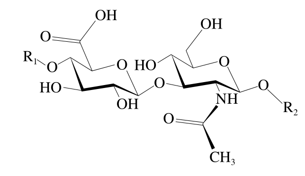 透明质酸(hyaluronic acid,HA)(图1),俗称玻尿酸,最早由美国哥伦比亚大学教授Meyer和Plamer从牛眼玻璃体中分离得到[1]。自然界中,HA广泛存在于动物的各种组织中,如关节腔、血管、心脏、眼、脑及皮肤等,其由D-葡萄糖醛酸(D-glucuronic acid,GlcA)和N-乙酰葡萄糖胺(N-acetylglucosamine,GlcNAc)通过β-1,3糖苷键相连组成双糖单元结构,然后又通过β-1,4-糖苷键连接形成线性非硫酸化的糖胺聚糖。一个完整的HA分子中重复双糖单元的数量可以达到10 000或更多,分子质量约为400万 Da(每个双糖分子质量约为400 Da)[2]。HA广泛分布于细胞外间质(extracellular matrix,ECM),并以高浓度存在于结缔组织中,如皮肤、滑液和玻璃体液[3]。HA是关节滑液的主要成分,起到润滑、减震、滋养关节的作用。其在人体膝关节中的质量浓度约为2~3 mg/mL,年轻人略高于老年人[4-5]。HA也是眼睛玻璃体的主要成分,但质量浓度较低,约为200 μg/mL[6];其次,HA在肺、肾、脑和肌肉中也有一定量的分布,但在肝脏组织中很少,在血清中的含量最低[3]。