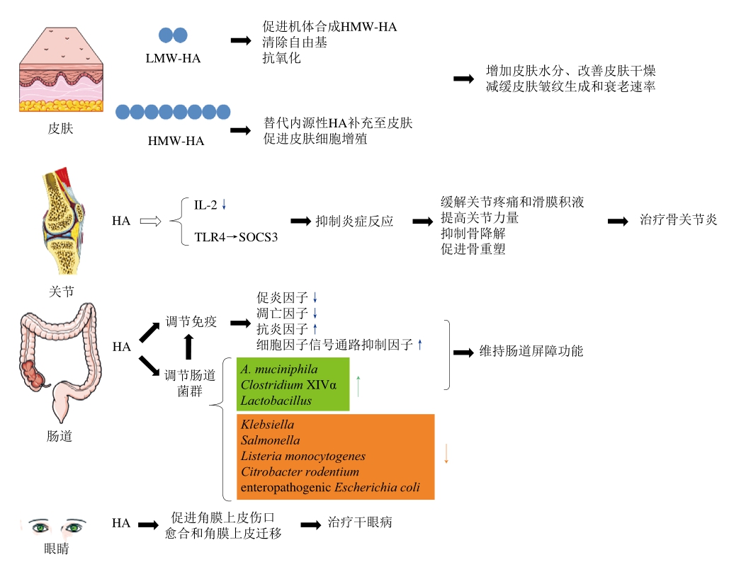 HA作为一种结构稳定的重复二糖(D-GlcA和GlcNAc)单元线性链状糖胺聚糖,广泛存在于机体细胞表面与细胞间基质中,具有多种生理功能,参与机体的多个生物学过程。HA经口给予后在体内被肠道菌群或酶降解为大小不同的片段,并被运送至不同部位分别发挥功能(图3)。随着年龄的增长,体内HA水平逐渐降低,口服HA有望对机体的HA进行补充,进而调节机体相关功能,促进和维持机体健康。目前,体内、体外实验以及患者双盲实验初步证明,口服HA在维持皮肤健康、修复关节损伤、调节肠道免疫、缓解干眼等方面扮演着重要的角色;同时,其安全性较高,不具有免疫原性、非过敏原,无生殖、发育和遗传毒性,对癌症转移无影响等。