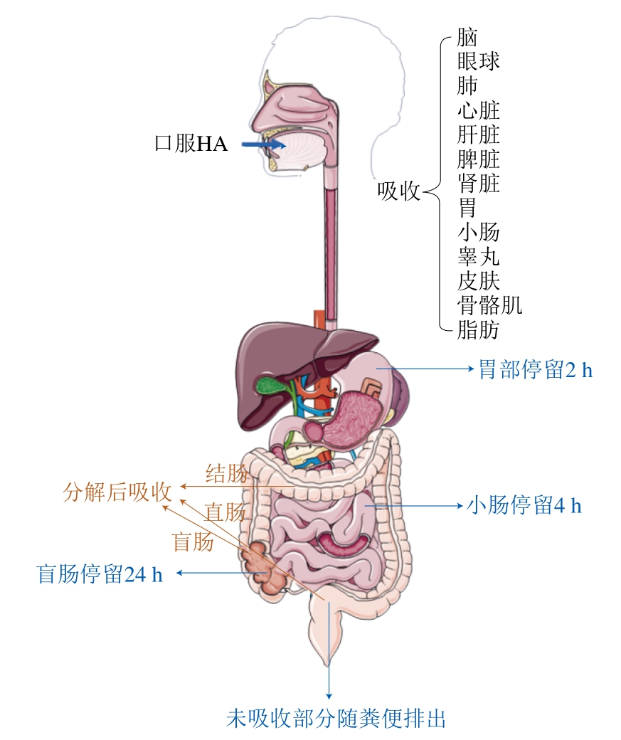 经口给予HA后,其在体内的滞留时间分别为:胃部2 h、小肠4 h、盲肠24 h(图2)[15-16]。人造胃液和人造小肠液的体外实验研究结果显示,HA不会被人造胃液或人造小肠液中的酶降解,反而能够在盲肠内容物中被降解为寡糖,且以二糖为主。HA在大肠中被分解后,在盲肠、结肠和直肠区域均会被吸收,未吸收部分则由粪便排出体外。HA被吸收后进入血液循环,而后转运至其他组织和器官[17]。同位素示踪法给药实验结果显示,小鼠经口给予HA后,HA能够迅速经血液分布至各组织中,13个受检组织(包括眼球、脑、皮肤、睾丸、骨骼肌、脂肪、肝脏、脾脏、肾脏、肺、心脏、小肠、胃)均有不同程度的放射性分布。其中,在0~4 h内,脾脏的代谢速率快于肝脏,睾丸和皮肤的代谢速率较慢;在0~12 h内,38.7%的放射性经粪便排出、18.6%的放射性经尿液排出[21]。HMW-HA可以通过内吞或胞饮进入细胞内,即细胞膜脂质层或网格蛋白包被高分子HA后通过内陷过程完成内吞。HA可在内吞小体中被HA酶1降解为HA寡糖;HA寡糖会被β-D-GlcA酶和β-N-乙酰-D-己糖胺酶通过协同活性降解为GlcA和GlcNAc结构单元或者HA寡糖通过胞吐被排出细胞外,胞吐的HA片段具有多种生物学功能[22]。上述结果提示HMW-HA需要经过胞饮/内吞进入胞内被降解,其降解片段再经胞吐作用被排至胞外发挥其生物学效应。