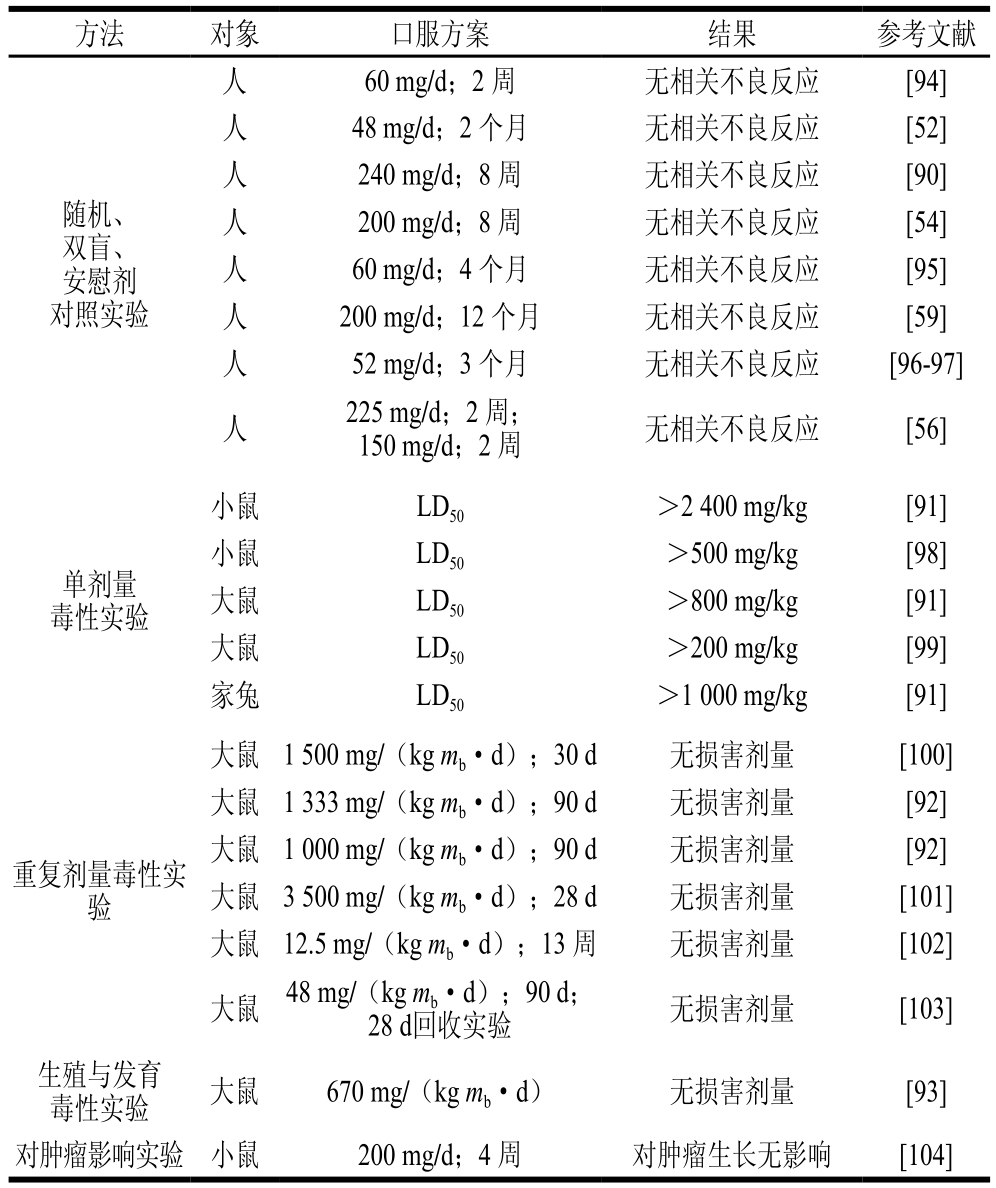 方法 对象 口服方案 结果 参考文献人随机、双盲、安慰剂对照实验60 mg/d;2 周 无相关不良反应 [94]人 48 mg/d;2个月 无相关不良反应 [52]人 240 mg/d;8 周 无相关不良反应 [90]人 200 mg/d;8 周 无相关不良反应 [54]人 60 mg/d;4个月 无相关不良反应 [95]人 200 mg/d;12个月 无相关不良反应 [59]人 52 mg/d;3个月 无相关不良反应 [96-97]人 225 mg/d;2 周;150 mg/d;2 周 无相关不良反应 [56]单剂量毒性实验小鼠 LD50 >2 400 mg/kg [91]小鼠 LD50 >500 mg/kg [98]大鼠 LD50 >800 mg/kg [91]大鼠 LD50 >200 mg/kg [99]家兔 LD50 >1 000 mg/kg [91]重复剂量毒性实验大鼠 1 500 mg/(kg mb·d);30 d 无损害剂量 [100]大鼠 1 333 mg/(kg mb·d);90 d 无损害剂量 [92]大鼠 1 000 mg/(kg mb·d);90 d 无损害剂量 [92]大鼠 3 500 mg/(kg mb·d);28 d 无损害剂量 [101]大鼠 12.5 mg/(kg mb·d);13 周 无损害剂量 [102]大鼠 48 mg/(kg mb·d);90 d;28 d回收实验 无损害剂量 [103]生殖与发育毒性实验 大鼠 670 mg/(kg mb·d) 无损害剂量 [93]对肿瘤影响实验 小鼠 200 mg/d;4 周 对肿瘤生长无影响 [104]