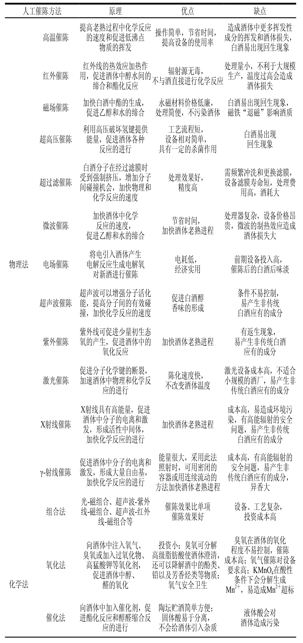 表2 白酒的不同人工催陈方法原理及优缺点比较