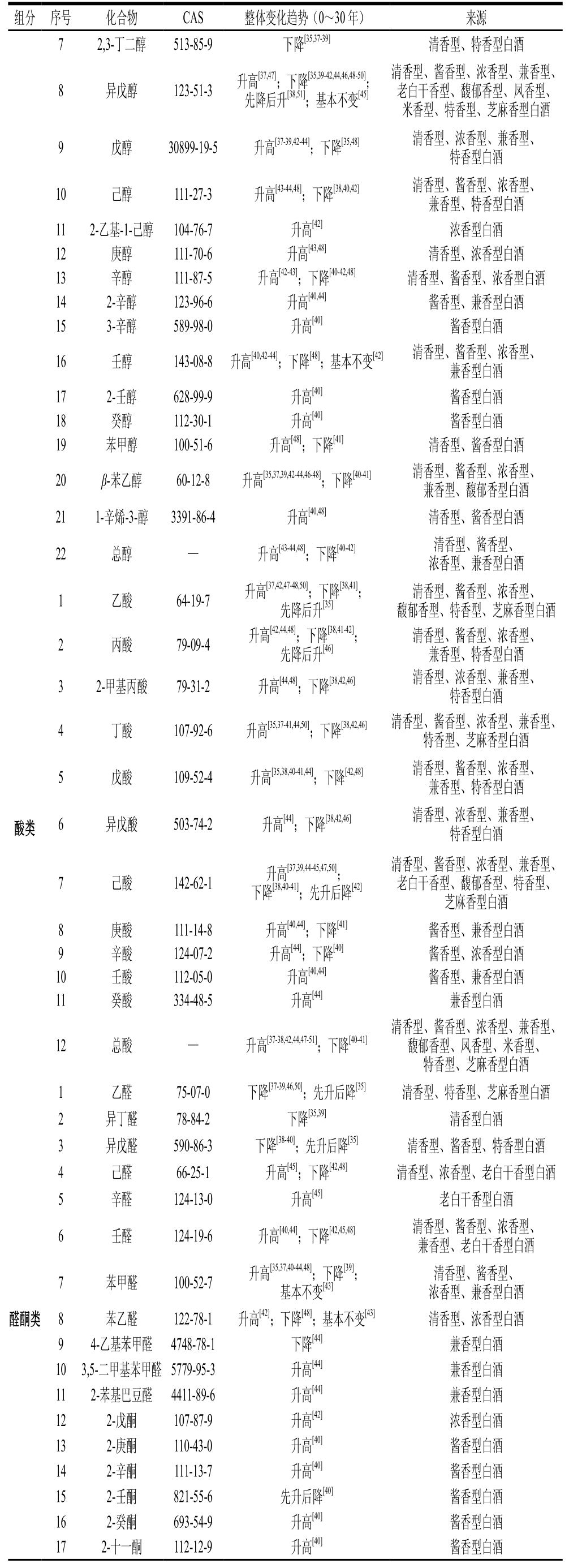组分 序号 化合物 CAS 整体变化趋势(0~30 年) 来源7 2,3-丁二醇 513-85-9 下降[35,37-39] 清香型、特香型白酒清香型、酱香型、浓香型、兼香型、老白干香型、馥郁香型、凤香型、米香型、特香型、芝麻香型白酒9 戊醇 30899-19-5 升高[37-39,42-44];下降[35,48] 清香型、浓香型、兼香型、特香型白酒10 己醇 111-27-3 升高[43-44,48];下降[38,40,42] 清香型、酱香型、浓香型、兼香型、特香型白酒11 2-乙基-1-己醇 104-76-7 升高[42] 浓香型白酒12 庚醇 111-70-6 升高[43,48] 清香型、浓香型白酒13 辛醇 111-87-5 升高[42-43];下降[40-42,48] 清香型、酱香型、浓香型白酒14 2-辛醇 123-96-6 升高[40,44] 酱香型、兼香型白酒15 3-辛醇 589-98-0 升高[40] 酱香型白酒16 壬醇 143-08-8 升高[40,42-44];下降[48];基本不变[42] 清香型、酱香型、浓香型、兼香型白酒17 2-壬醇 628-99-9 升高[40] 酱香型白酒18 癸醇 112-30-1 升高[40] 酱香型白酒19 苯甲醇 100-51-6 升高[48];下降[41] 清香型、酱香型白酒20 β-苯乙醇 60-12-8 升高[35,37,39,42-44,46-48];下降[40-41] 清香型、酱香型、浓香型、兼香型、馥郁香型白酒21 1-辛烯-3-醇 3391-86-4 升高[40,48] 清香型、酱香型白酒22 总醇 — 升高[43-44,48];下降[40-42] 清香型、酱香型、浓香型、兼香型白酒8 异戊醇 123-51-3 升高[37,47];下降[35,39-42,44,46,48-50];先降后升[38,51];基本不变[45]1 乙酸 64-19-7 升高[37,42,47-48,50];下降[38,41];先降后升[35]清香型、酱香型、浓香型、馥郁香型、特香型、芝麻香型白酒2 丙酸 79-09-4 升高[42,44,48];下降[38,41-42];先降后升[46]酸类清香型、酱香型、浓香型、兼香型、特香型白酒3 2-甲基丙酸 79-31-2 升高[44,48];下降[38,42,46] 清香型、浓香型、兼香型、特香型白酒4 丁酸 107-92-6 升高[35,37-41,44,50];下降[38,42,46] 清香型、酱香型、浓香型、兼香型、特香型、芝麻香型白酒5 戊酸 109-52-4 升高[35,38,40-41,44];下降[42,48] 清香型、酱香型、浓香型、兼香型、特香型白酒6 异戊酸 503-74-2 升高[44];下降[38,42,46] 清香型、浓香型、兼香型、特香型白酒清香型、酱香型、浓香型、兼香型、老白干香型、馥郁香型、特香型、芝麻香型白酒8 庚酸 111-14-8 升高[40,44];下降[41] 酱香型、兼香型白酒9 辛酸 124-07-2 升高[44];下降[40] 酱香型、浓香型白酒10 壬酸 112-05-0 升高[40,44] 酱香型、兼香型白酒11 癸酸 334-48-5 升高[44] 兼香型白酒7 己酸 142-62-1 升高[37,39,44-45,47,50];下降[38,40-41];先升后降[42]12 总酸 — 升高[37-38,42,44,47-51];下降[40-41]清香型、酱香型、浓香型、兼香型、馥郁香型、凤香型、米香型、特香型、芝麻香型白酒清香型、酱香型、浓香型、兼香型白酒8 苯乙醛 122-78-1 升高[42];下降[48];基本不变[43] 清香型、浓香型白酒9 4-乙基苯甲醛 4748-78-1 下降[44] 兼香型白酒10 3,5-二甲基苯甲醛 5779-95-3 升高[44] 兼香型白酒11 2-苯基巴豆醛 4411-89-6 升高[44] 兼香型白酒12 2-戊酮 107-87-9 升高[42] 浓香型白酒13 2-庚酮 110-43-0 升高[40] 酱香型白酒14 2-辛酮 111-13-7 升高[40] 酱香型白酒15 2-壬酮 821-55-6 先升后降[40] 酱香型白酒16 2-癸酮 693-54-9 升高[40] 酱香型白酒17 2-十一酮 112-12-9 升高[40] 酱香型白酒1 乙醛 75-07-0 下降[37-39,46,50];先升后降[35] 清香型、特香型、芝麻香型白酒2 异丁醛 78-84-2 下降[35,39] 清香型白酒3 异戊醛 590-86-3 下降[38-40];先升后降[35] 清香型、酱香型、特香型白酒4 己醛 66-25-1 升高[45];下降[42,48] 清香型、浓香型、老白干香型白酒5 辛醛 124-13-0 升高[45] 老白干香型白酒6 壬醛 124-19-6 升高[40,44];下降[42,45,48] 清香型、酱香型、浓香型、兼香型、老白干香型白酒7 苯甲醛 100-52-7 升高[35,37,40-44,48];下降[39];基本不变[43]醛酮类