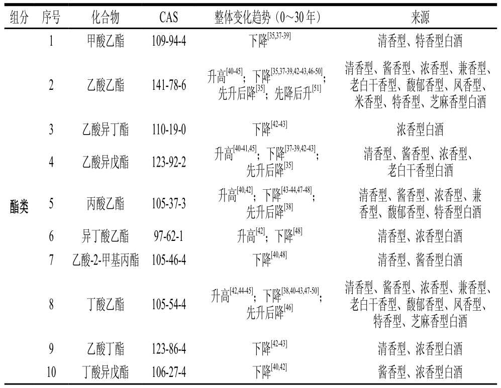 组分 序号 化合物 CAS 整体变化趋势(0~30 年) 来源1 甲酸乙酯 109-94-4 下降[35,37-39] 清香型、特香型白酒清香型、酱香型、浓香型、兼香型、老白干香型、馥郁香型、凤香型、米香型、特香型、芝麻香型白酒3 乙酸异丁酯 110-19-0 下降[42-43] 浓香型白酒4 乙酸异戊酯 123-92-2 升高[40-41,45];下降[37-39,42-43];先升后降[35]2 乙酸乙酯 141-78-6 升高[40-45];下降[35,37-39,42-43,46-50];先升后降[35];先降后升[51]酯类清香型、酱香型、浓香型、老白干香型白酒5 丙酸乙酯 105-37-3 升高[40,42];下降[43-44,47-48];先升后降[38]清香型、酱香型、浓香型、兼香型、馥郁香型、特香型白酒6 异丁酸乙酯 97-62-1 升高[42];下降[48] 清香型、浓香型白酒7 乙酸-2-甲基丙酯 105-46-4 下降[40,48] 清香型、酱香型白酒清香型、酱香型、浓香型、兼香型、老白干香型、馥郁香型、凤香型、特香型、芝麻香型白酒9 乙酸丁酯 123-86-4 下降[42-43] 清香型、浓香型白酒10 丁酸异戊酯 106-27-4 下降[40,42] 酱香型、浓香型白酒8 丁酸乙酯 105-54-4 升高[42,44-45];下降[38,40-43,47-50];先升后降[46]
