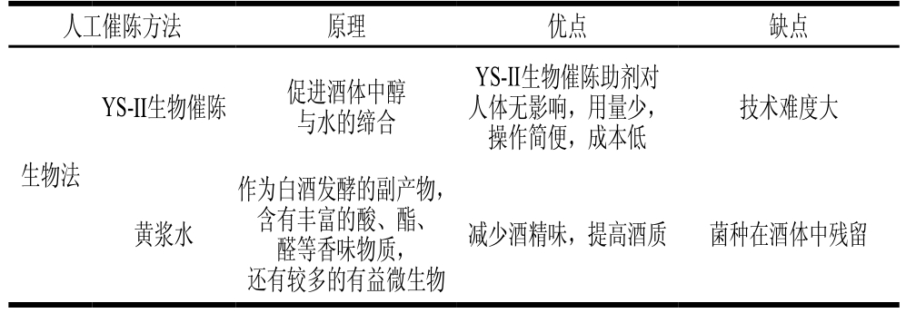 人工催陈方法 原理 优点 缺点YS-II生物催陈 促进酒体中醇与水的缔合YS-II生物催陈助剂对人体无影响,用量少,操作简便,成本低技术难度大生物法黄浆水作为白酒发酵的副产物,含有丰富的酸、酯、醛等香味物质,还有较多的有益微生物减少酒精味,提高酒质 菌种在酒体中残留