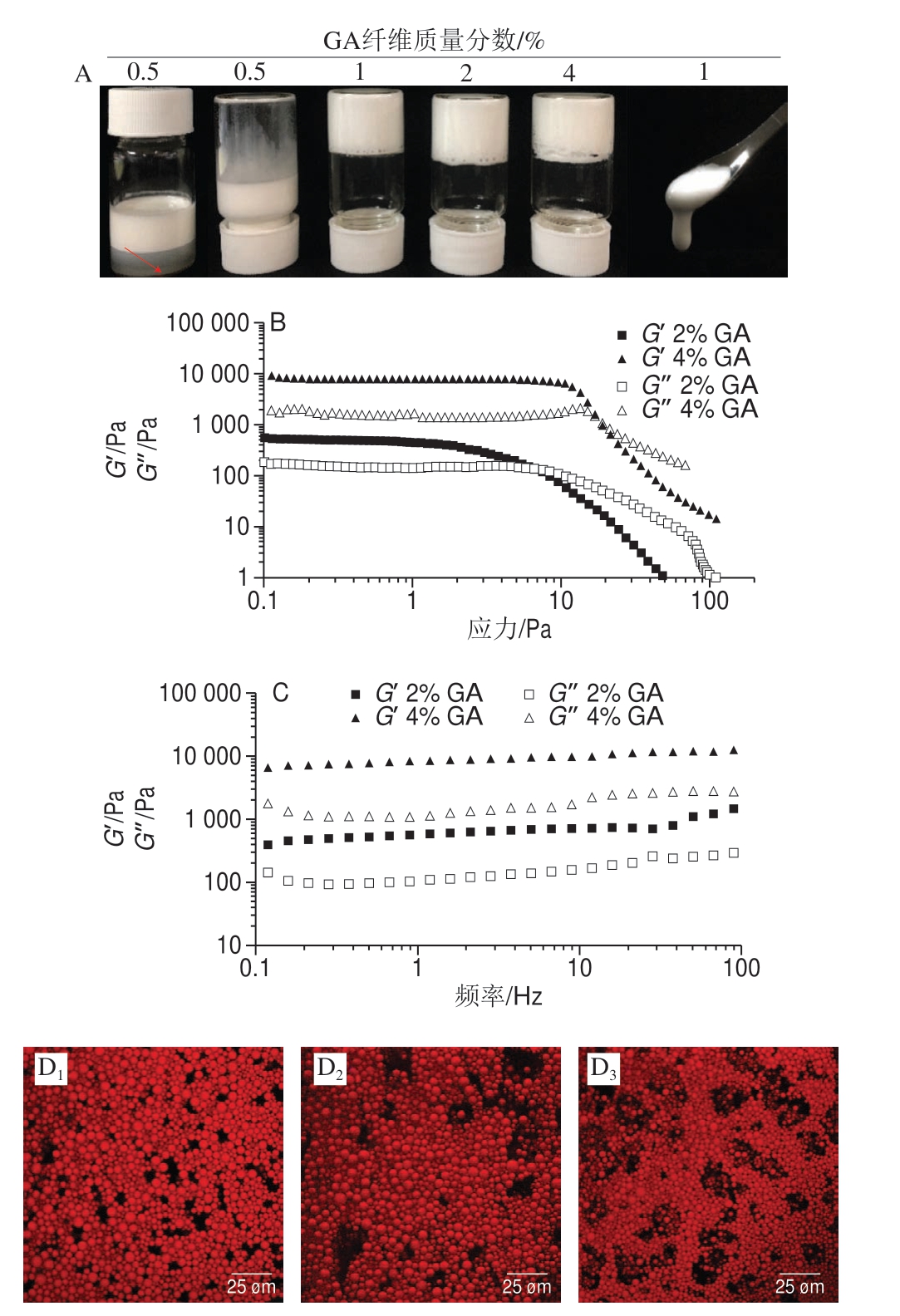 图2 不同GA纤维质量分数下的乳液凝胶外观(A)、应力扫描(B)、频率扫描(C)和CLSM(D)图