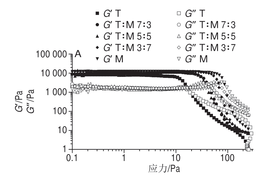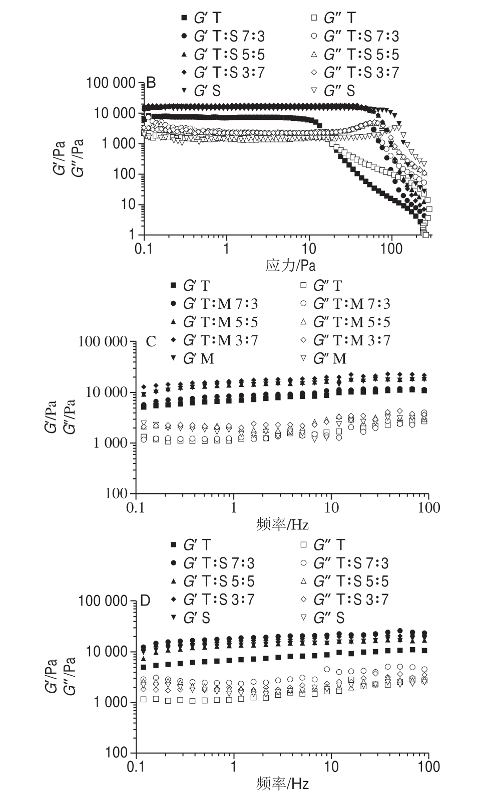 图5 不同混合油比例下的乳液凝胶的应力扫描图(A和B)和频率扫描图(C和D)
