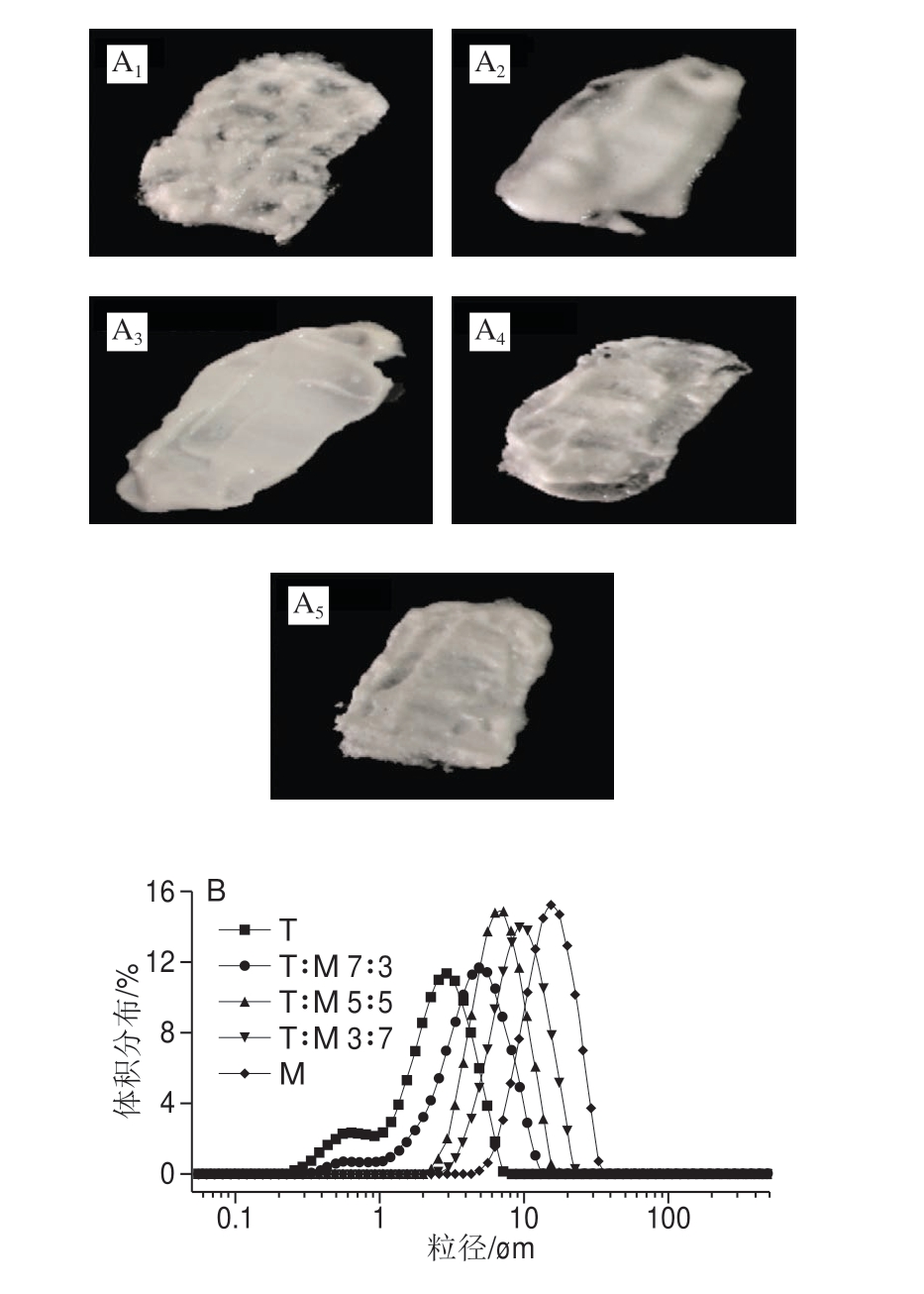 图4 不同混合油比例下的乳液凝胶外观图(A)、复合乳液粒度分布图(B和C)