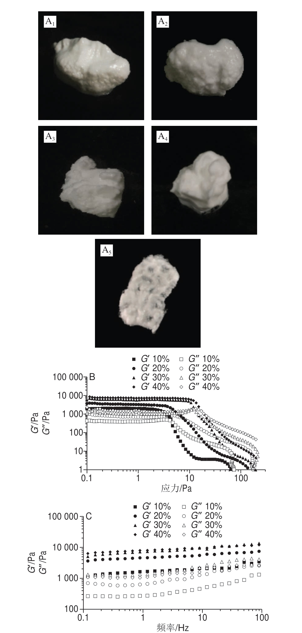 Fig.3 Photographs (A), amplitude sweeps (B) and frequency sweeps (C) of emulsion gels made with different TTO concentrations