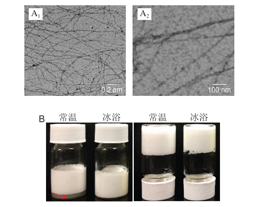 图1 GA纤维(0.1%)的TEM(A)及不同冷却方式制备的纤维乳液凝胶(4% GA纤维、40%茶树精油)外观图(B)