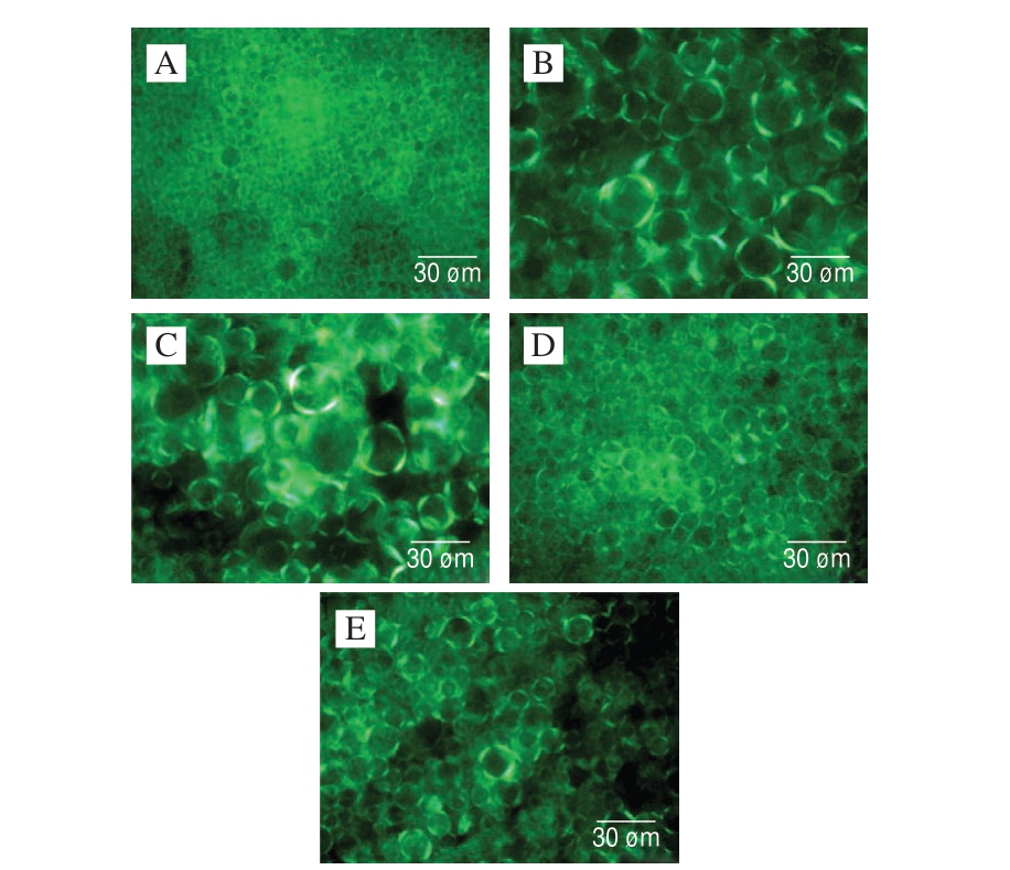 Fig.7 CLSM images of emulsion gels with different oil phase compositions