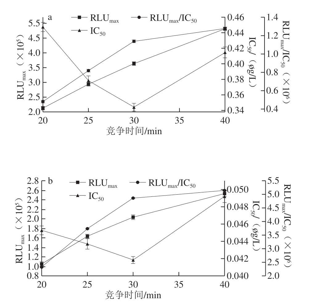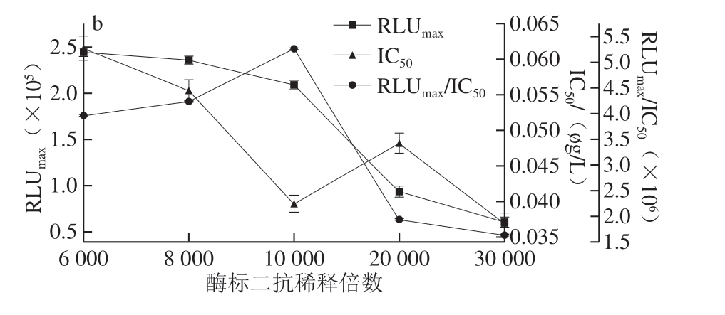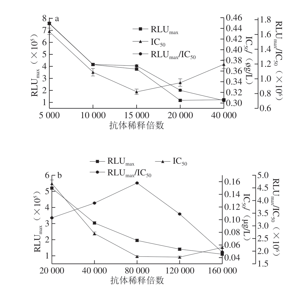 AMA的羊抗兔酶标二抗按2 000、4 000、6 000、8 000 倍和10 000 倍稀释,CAP的羊抗鼠酶标二抗按6 000、8 000、10 000、20 000 倍和30 000 倍稀释,以20、25、30 min和40 min竞争时间反应,按照1.3.1节的步骤操作,以RLUmax/IC50较高、IC50较低、RLUmax适中时的条件为CLEIA的最佳反应条件。